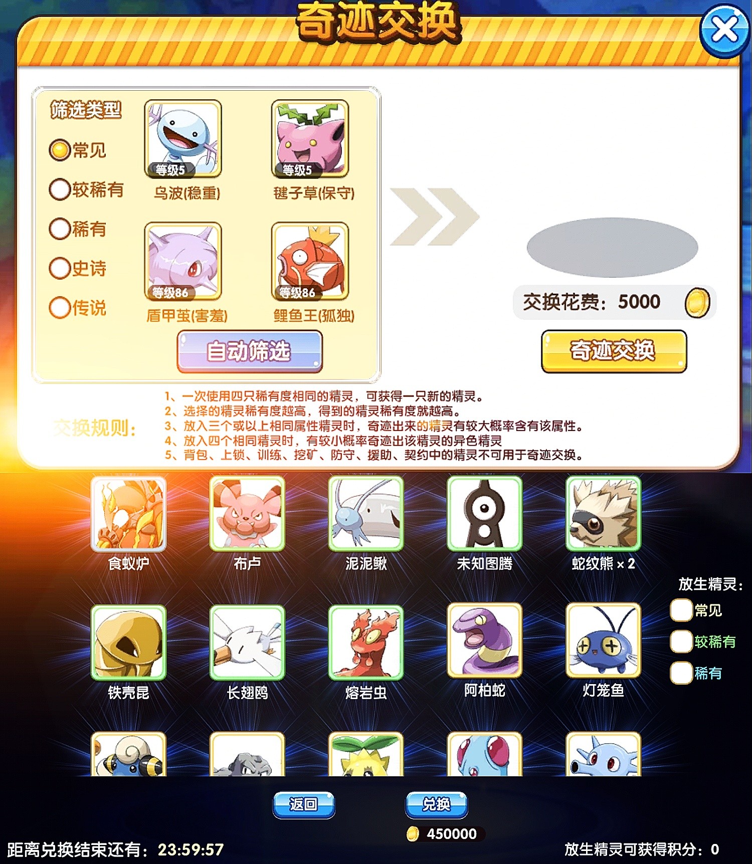 我相信。某些玩家为了刷得妙蛙种子,杰尼龟,喷火龙的好性格等等或者是伊布、皮丘,纷纷去奇迹交换!!擦亮眼睛了!金币100连抽换一次45w金币,而且每交换一次就要5000金币!搞几下子,你的金币就没了。最好还是别去了,情愿中级场洗。(除非你屯了太多的金币,花不完,那就随意喽)
