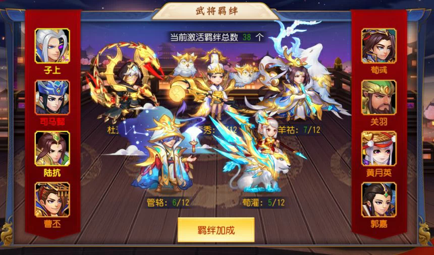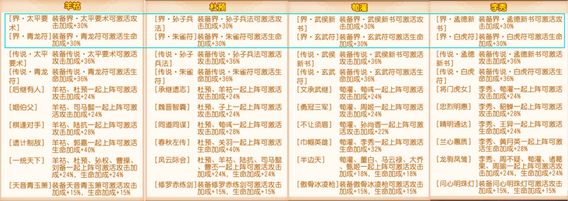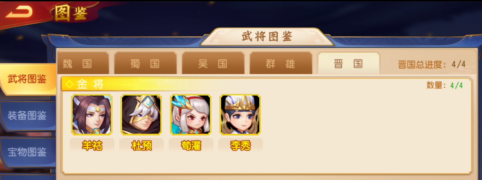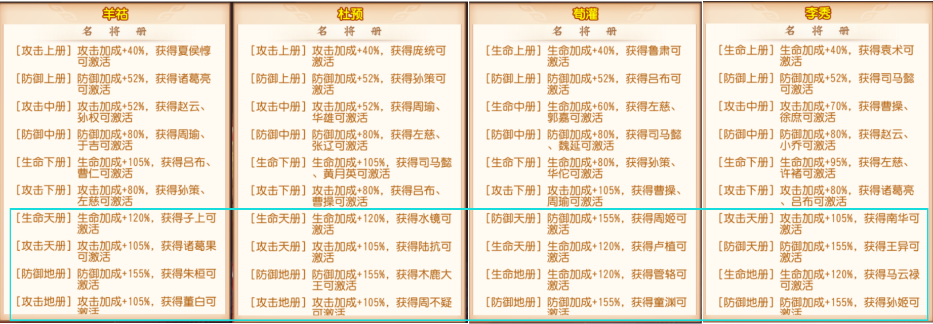 其他说明(名将册、羁绊、获取方式):晋将的名将册和武将羁绊都用到了其他四个国家的武将,而其他四个国家的武将并没有因为晋将的更新增加新的名将册,目前单个武将名将册的数量最高还是10条,以下为四个晋将的名将册和羁绊情况: