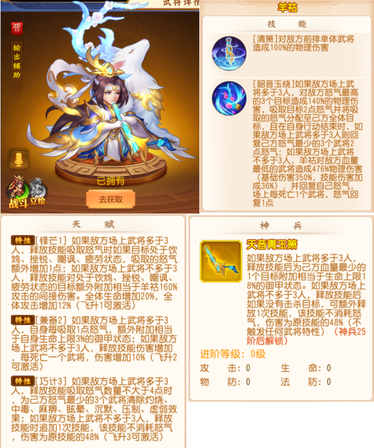 羊祜属于开局当辅助,残局变输出的一个武将,核心特性吸取怒气=减怒+回怒,武将风格上有点偏群雄,而且都是3个目标减2怒的技能,对标卢植;实战测试下,开局没有多少输出性,飞升1的间接伤害需要搭配比较苛刻的控制环境才能发挥出来,不过吸取怒气的技能比较强势,由于是吸取而不是减怒,