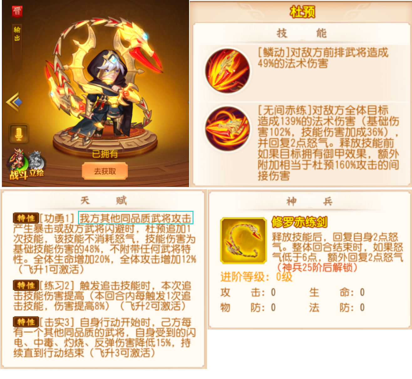 非常存粹的输出武将,核心特性都在飞升1、2,培养性价比比较高,附带对御甲目标的间接伤害输出,很契合现在中后期高资源对局的环境,但飞升3的特性比较鸡肋,目前环境实战下,收益性不大;杜预整体特性看下来跟司马懿很相似,都是群体输出+一定概率的追击,在初始爆发上比司马懿不会比司马懿强多少,但是搭配到多金将的阵容中充当主力或二核输出,凭借高频繁的追击技能,输出不不会弱多少!