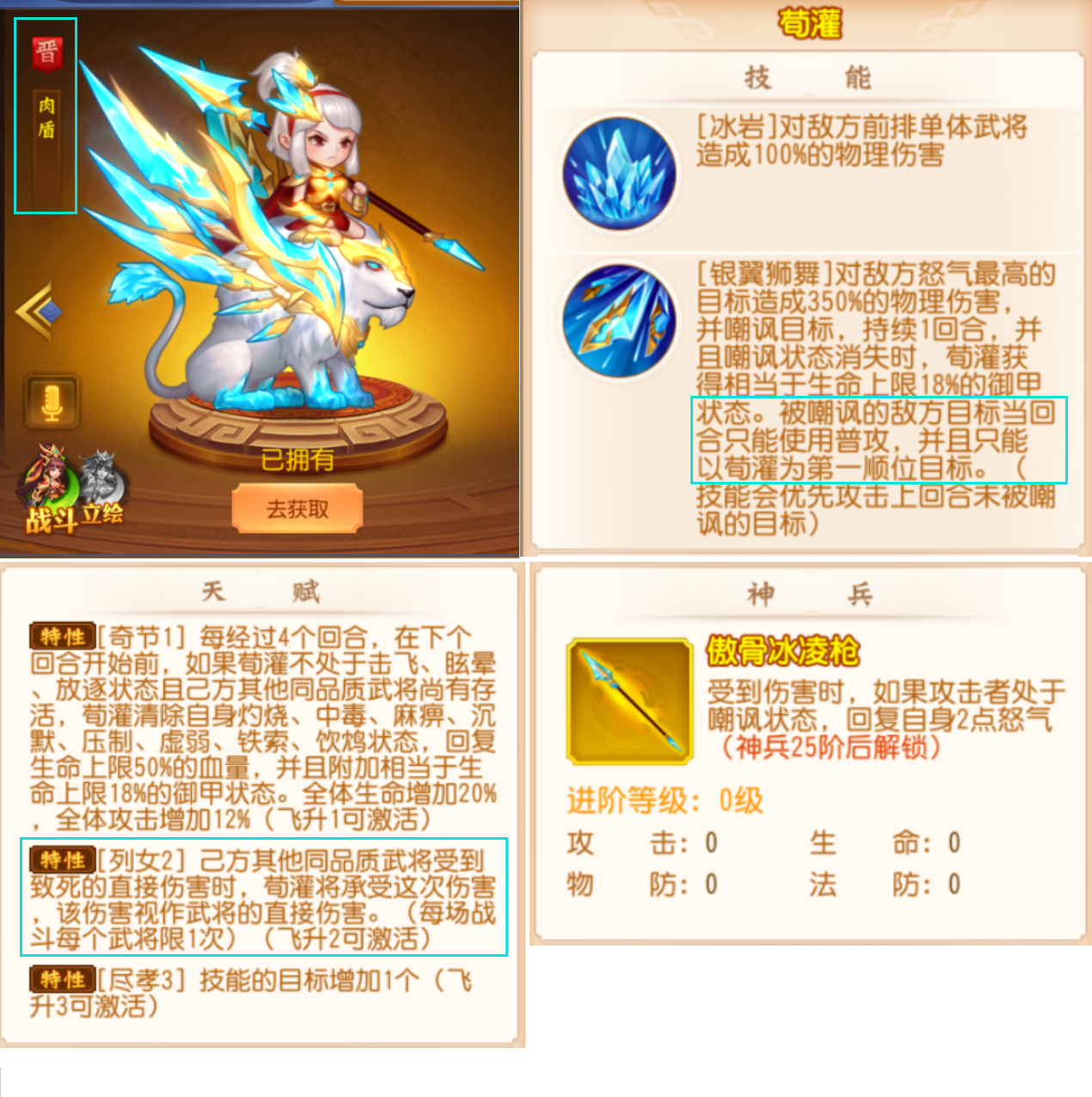 作为一个女性肉盾武将,荀灌带来了全新的控制效果“嘲讽”,嘲讽的效果就相当变相的沉默,让对手只能放普攻不能放技能,并且嘲讽还针对了怒气最高的目标,并且是没有概率限制必定会生效的控制效果,不会像王异的虚弱那样还得要魏国武将来加持;除了控制效果以外,荀灌作为肉盾武将的防御性也十分出色,飞升1的特性有着超高的稳定回血+状态清除能力,搭配破釜沉舟锦囊生存能力极强,只要不是遇到战力碾压,并且带有追魂特性的输出,荀灌都很难死掉!