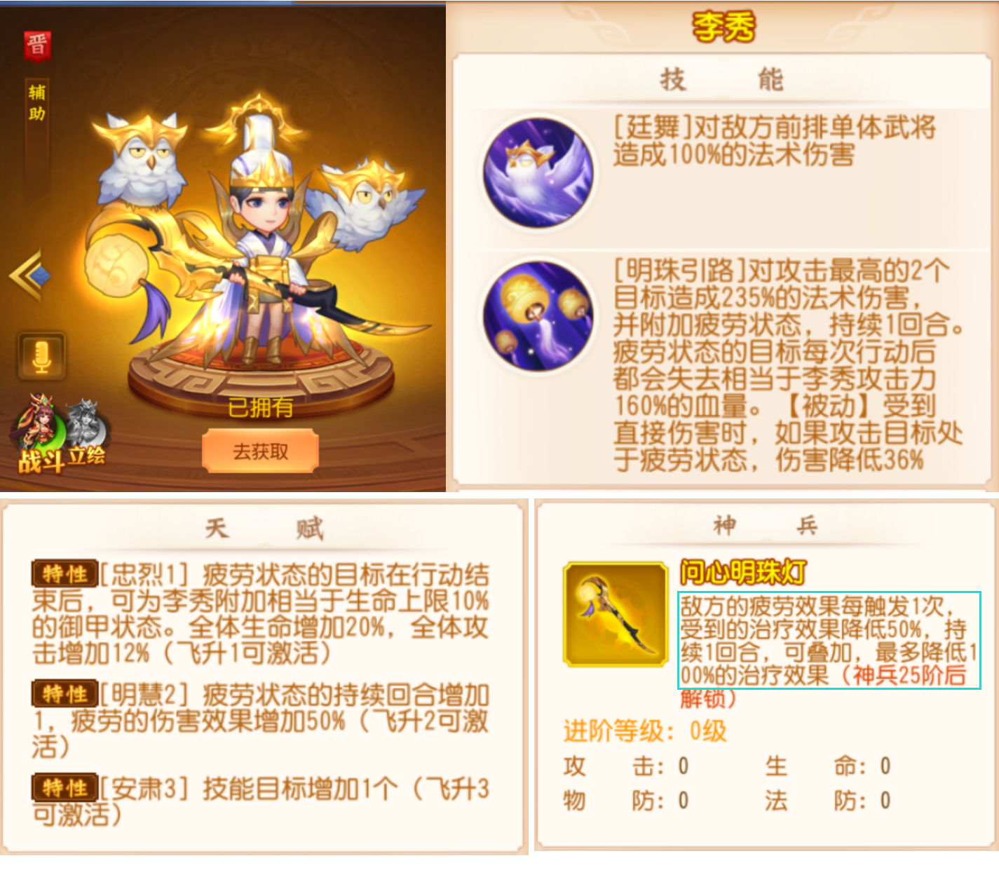 李秀的武将特性中引入一个新的状态“疲劳”,作为辅助武将,她能够带来一定量的固定输出和对治疗效果的限制,疲劳效果跟中毒伤害的判定有点像,扣除160%攻击力数值的血量相当于是贾诩突破+8的毒伤的输出比例,飞升2后可以提升疲劳的伤害,针对李秀的特性有两点测试结果说明一下: