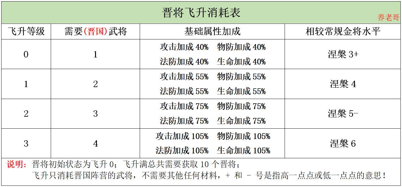 能推断出今后晋国只会出金将了,不会再出红将和橙将,晋国武将理所应当的就会成为培养方便上阵简单的代表了,加上晋将的特性强度普遍都偏高,最终结果就是能氪金就变强!以下为晋将飞升的消耗表: