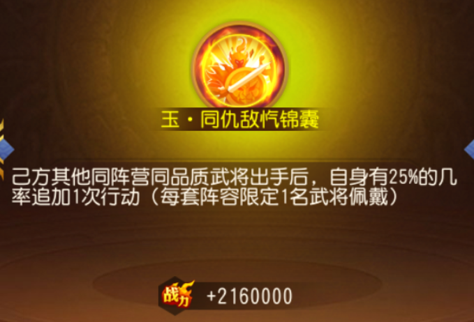 非常强力的一个锦囊,适用于肉盾武将以外的其他所有武将,给输出将带可以提高伤害,给控制将带可以提高压制效果,虽然触发额外行动的几率只有25%,但是一回合可以判定多次,在纯国家阵容中用收益最大。