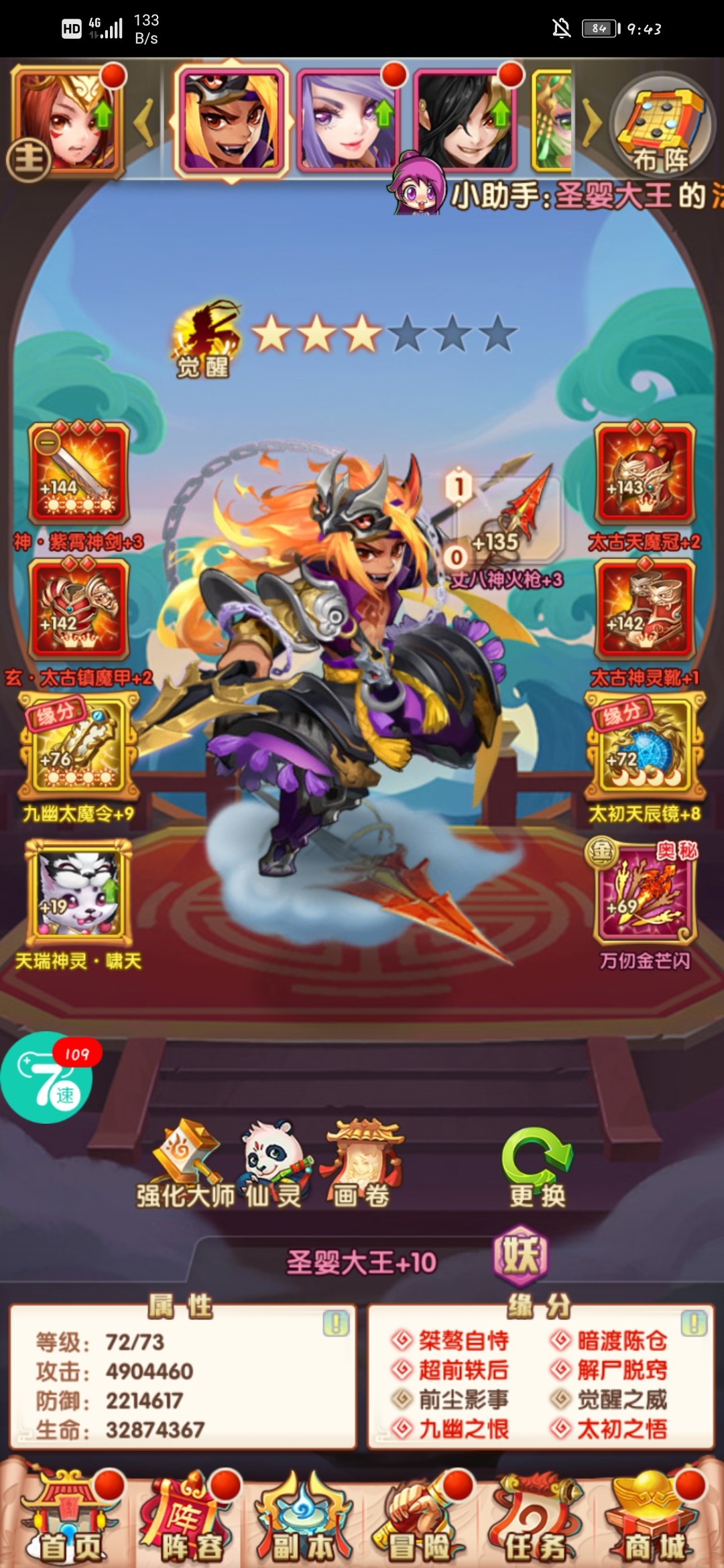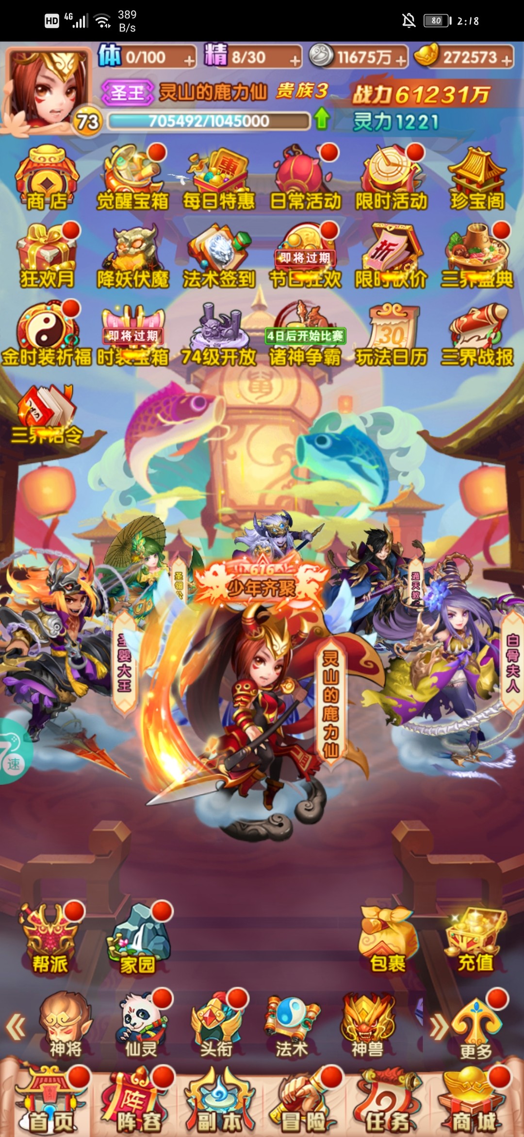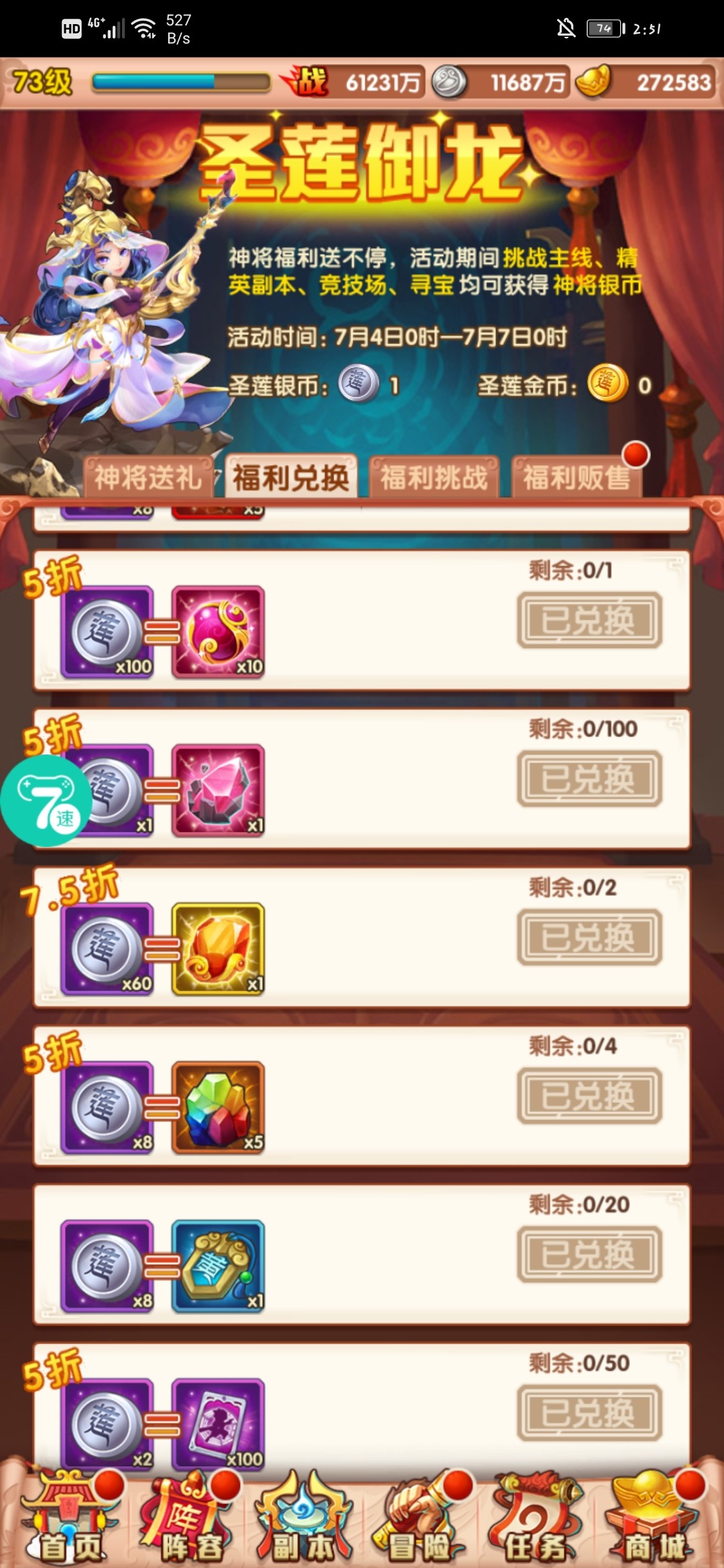 今天73级了。战力日常上一点点😂白嫖想提升战力很不容易,过程很漫长。