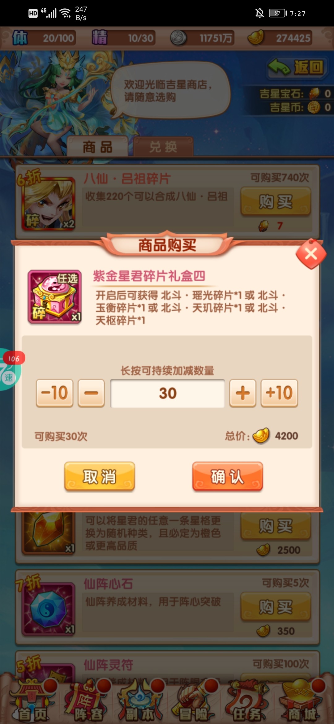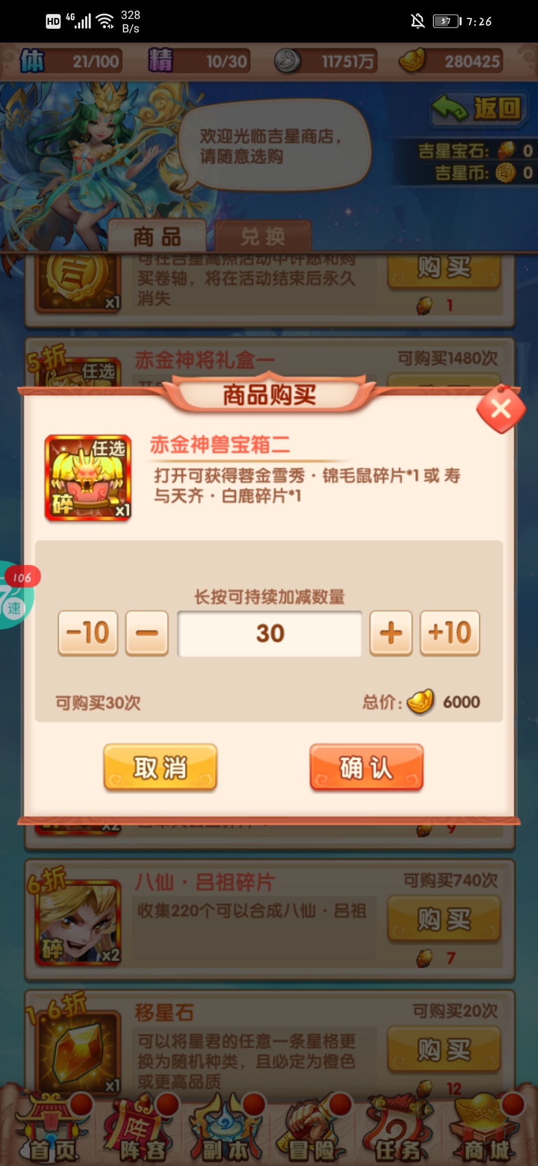 吉星高照:需要花12800元宝买十个,可以给400个金币。买一次需要40。但是抽这个要看运气,咱们买的最少8片,所以只能买9次。白嫖的话需要3次活动出白板。因为是辅助星君,没必要升太高。