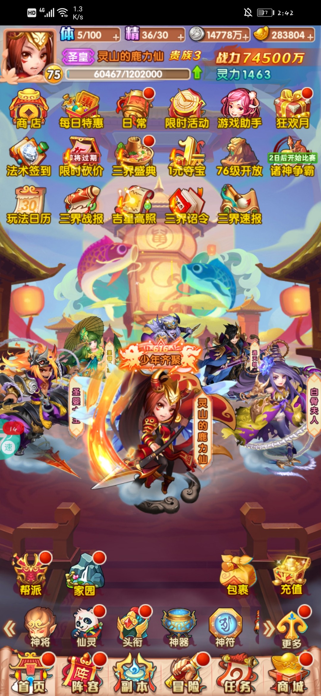 游商买了好多双丹,升到78级。解锁了方寸山,巡游天地(金卡图鉴);77级解锁的神器;76级的狮驼岭。