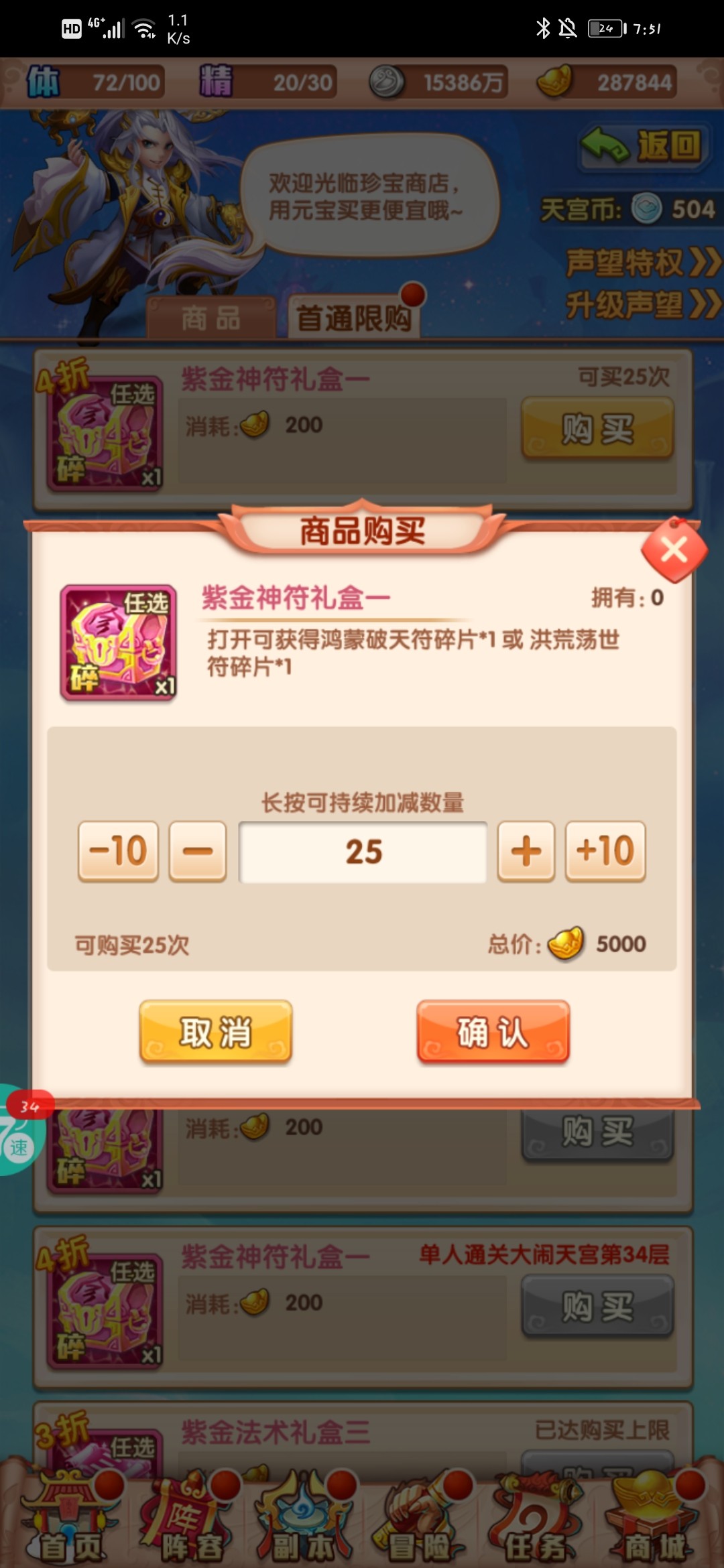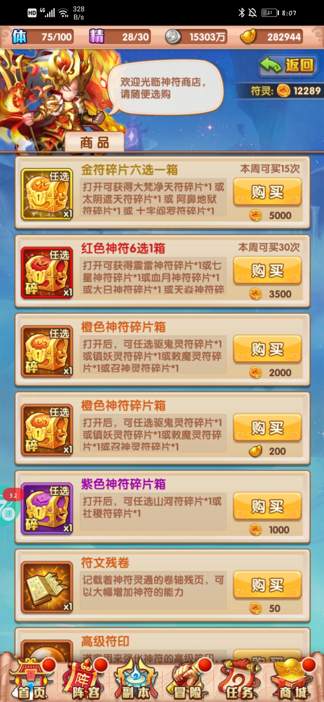 最后等级礼包依旧不买,7500元宝才一个橙色神符。这么多元宝买别的不香嘛?