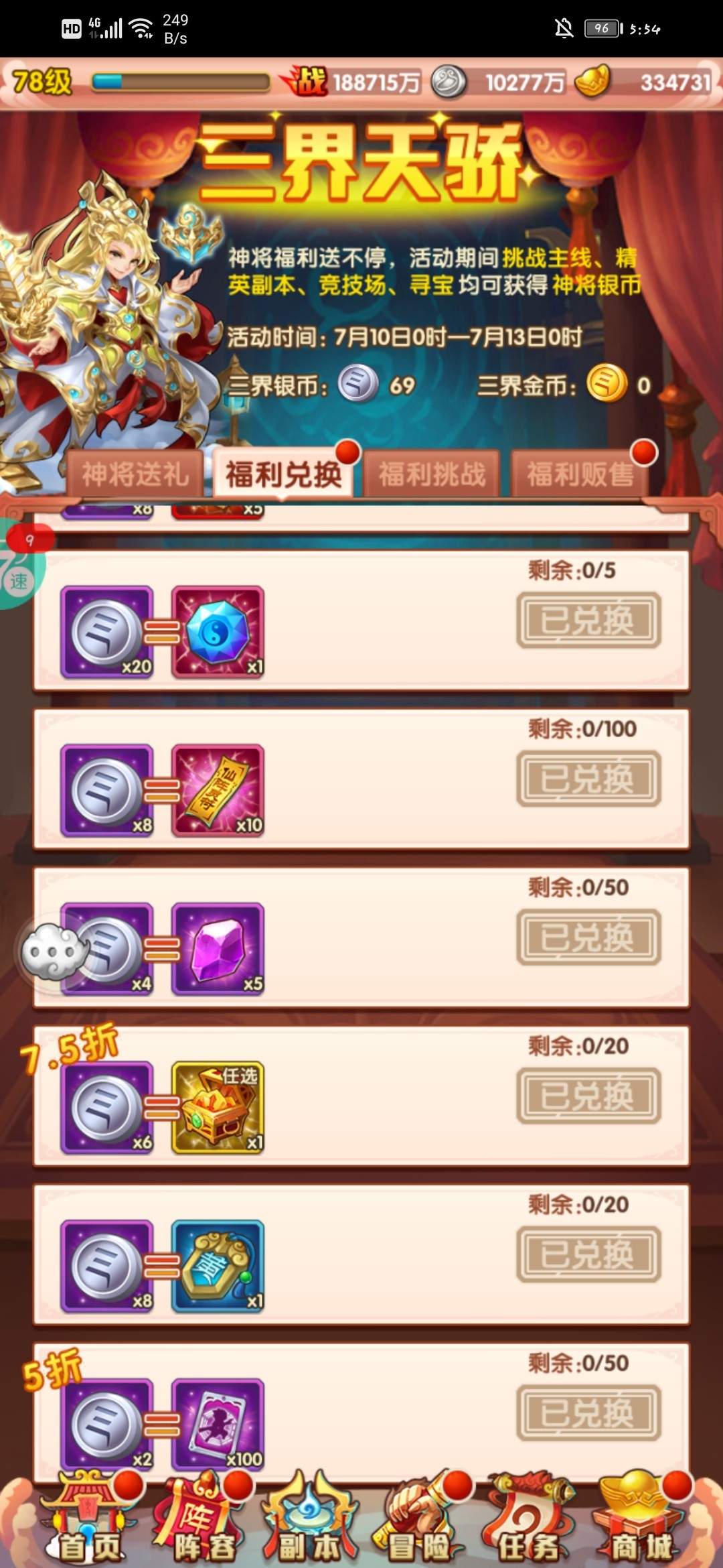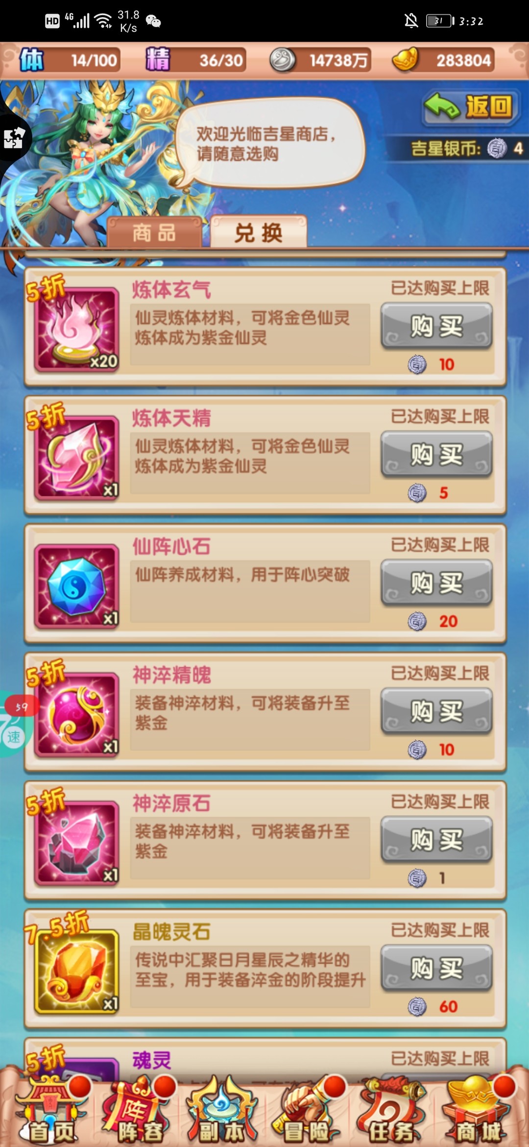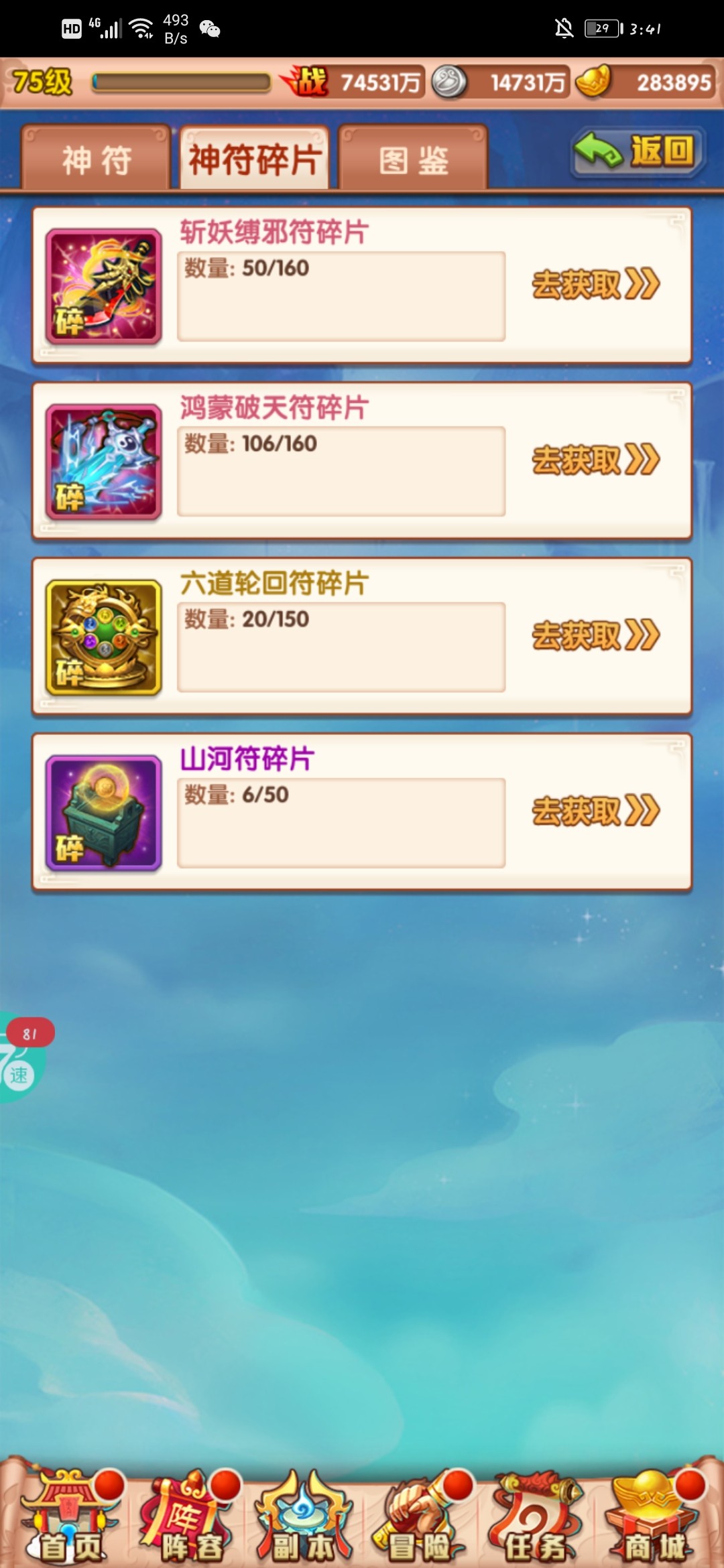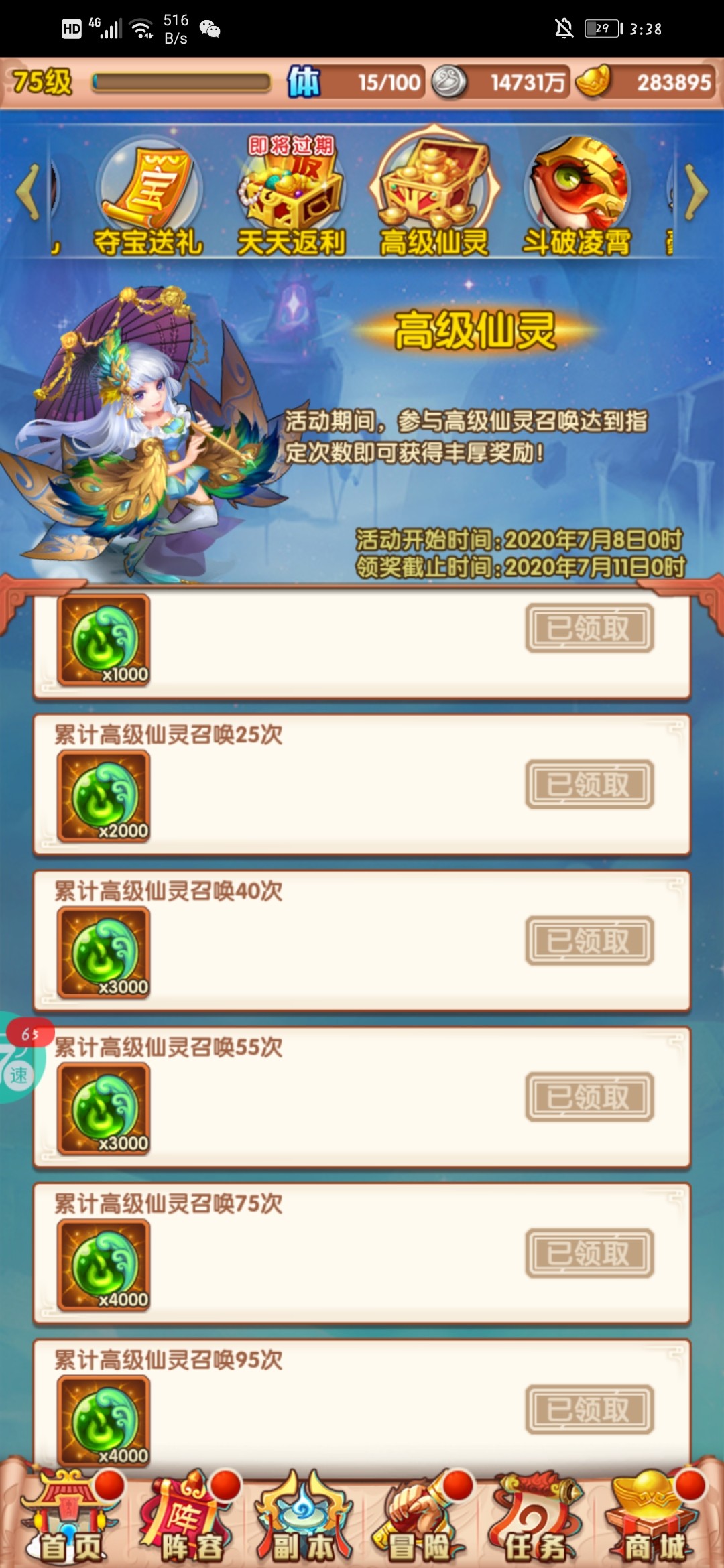 前几天一直存着的,这个直接拿满,换橙色开图鉴。这个活动换完就要存仙灵召唤令,95个等活动。