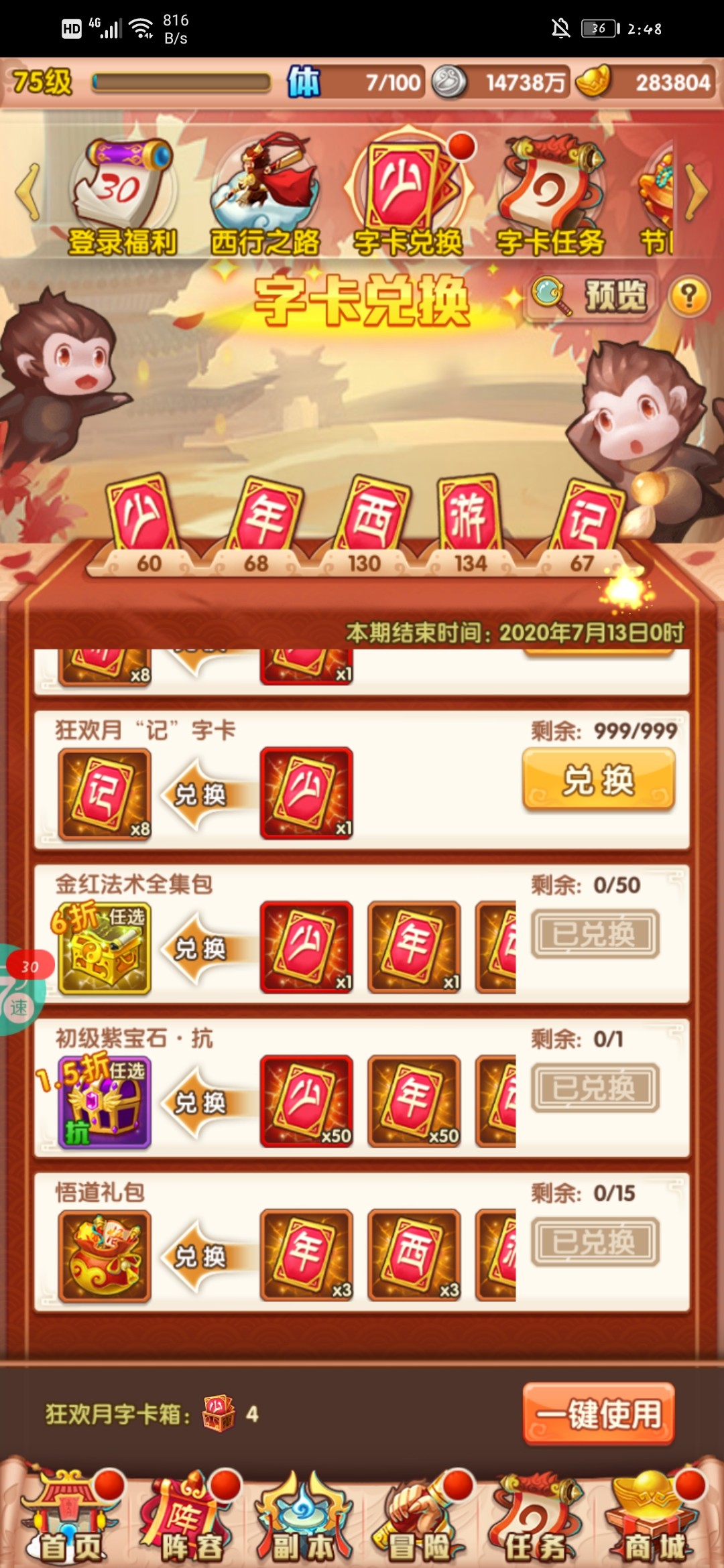 明天月狂欢就更新了,任务没做完的把任务做完,字卡我就换了金符石,金神兽,仙灵孵化宝箱,还有10个灵气宝箱。金装宝箱暂时不急,先把前期有用的换一下。剩下的少就留着后两周换。