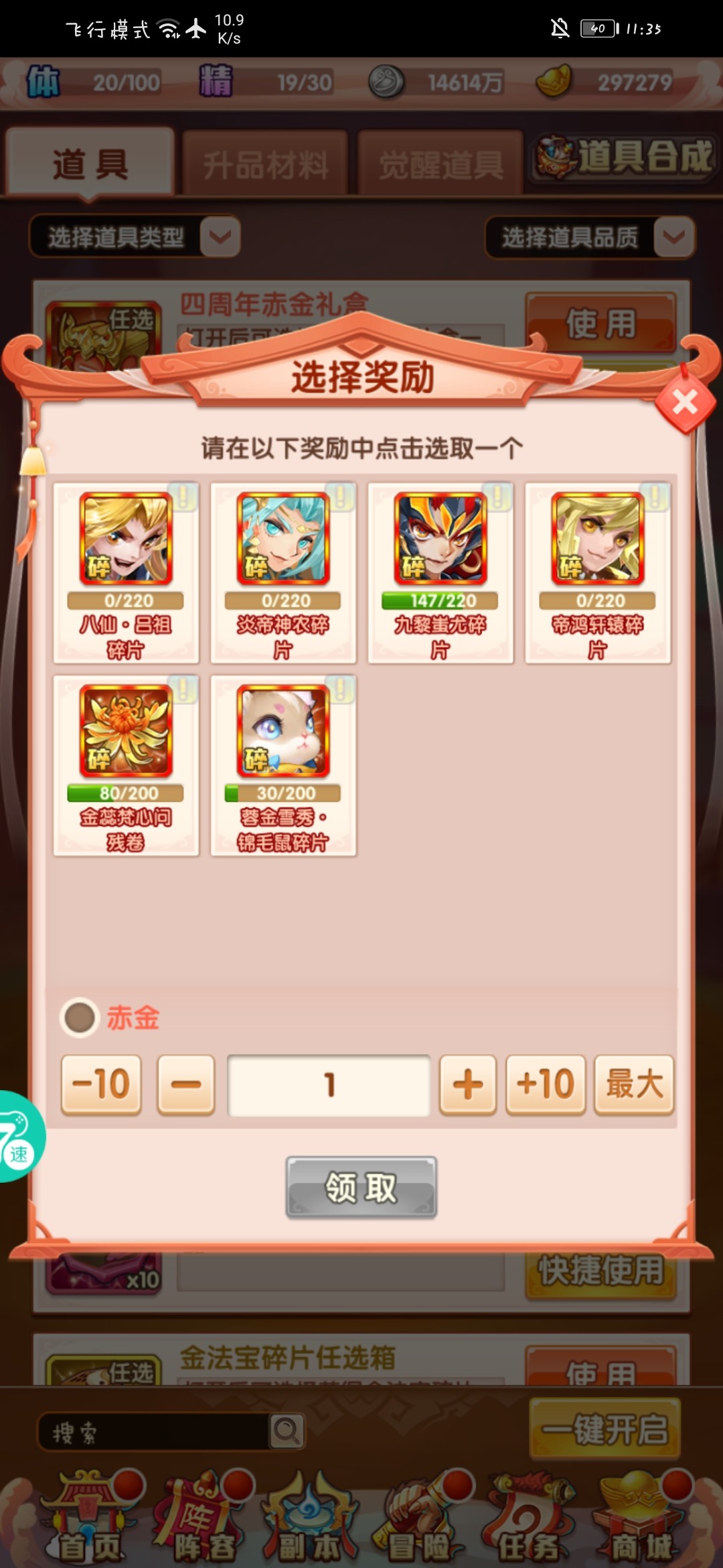 奖励这些,选一个我紫金四没出来就要了紫金四,先拿没有的,凑白板。有神兽,有法术,有紫金四就先换神符斩妖。