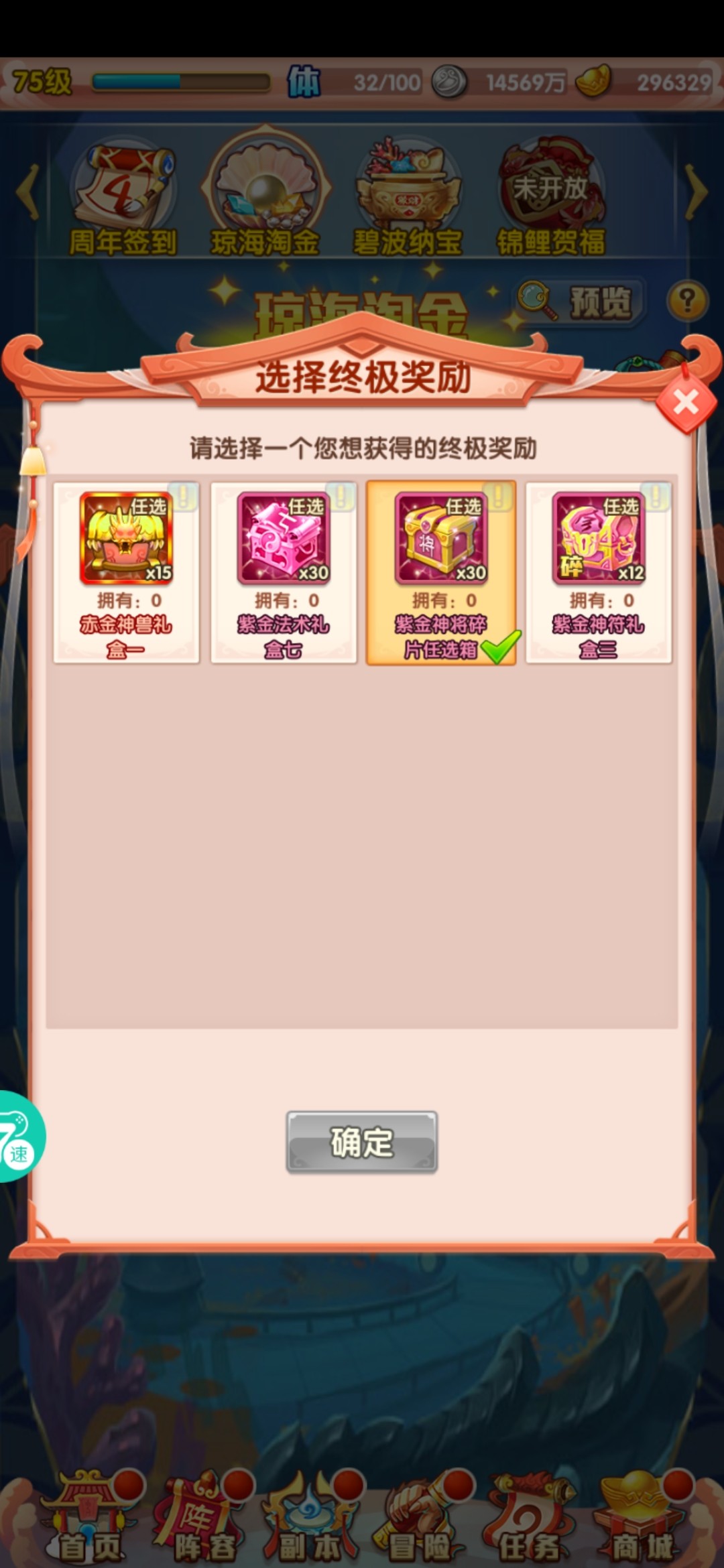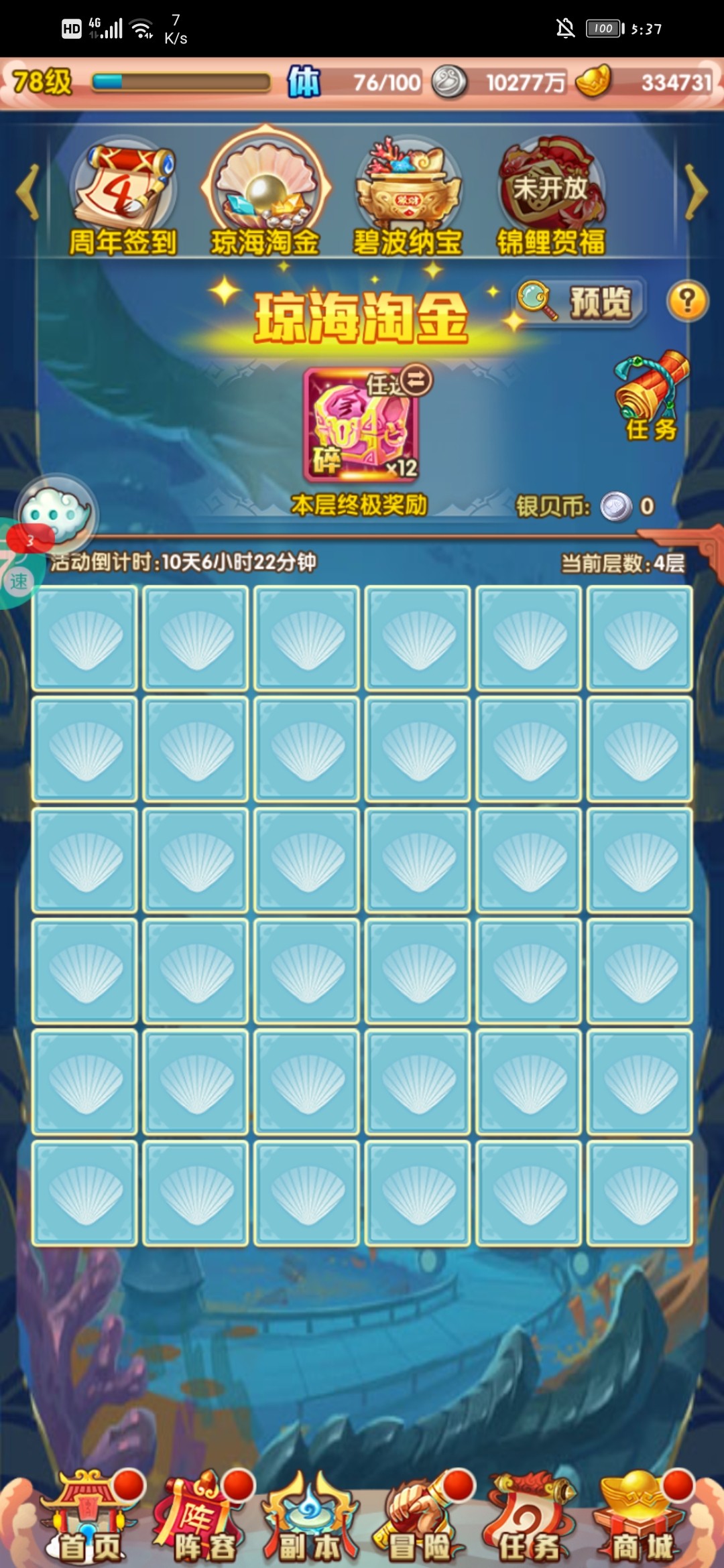 琼海淘金------活跃任务每日拿完,600个银贝币。活动13天。翻牌概率翻到终极奖励,翻到了可以直接进入下一级,最后把水晶翻出来在去下一层。