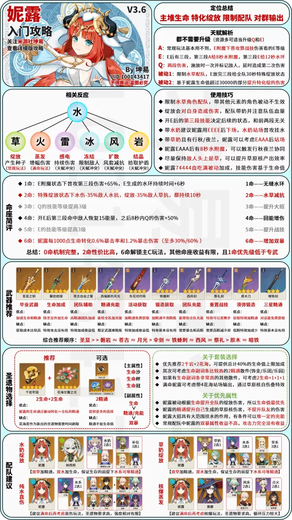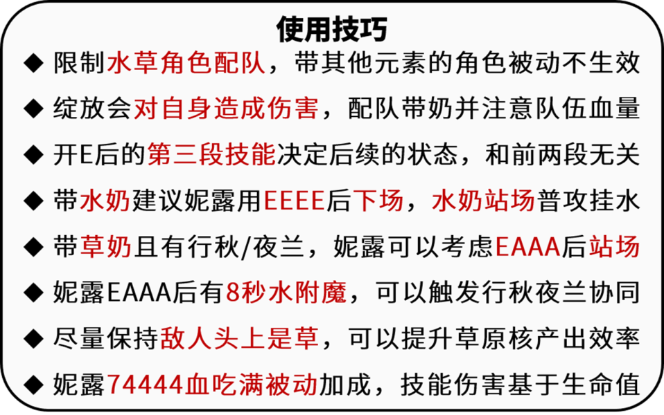 作者总结——妮露是一位在限制水草配队下能够提高绽放伤害的特化辅助角色,机制以及技能倍率都和生命属性有关,所以角色等级非常重要,在低命情况下自身伤害能力有限,可以放弃升级天赋等级,完全靠绽放反应打伤害,在对群环境中表现出色,0命基本完全体,圣遗物只堆生命即可养成难度很低,对操作也没什么需求,目前草系角色也比第一次UP时丰富很多,配队非常多样化,是新人玩家打深渊的最佳选择之一。