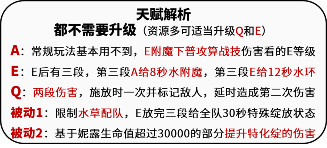 评价:基本用不到的技能,一方面妮露主堆生命没有多少攻击力,另一方面妮露站场玩法也是通过E技能的水附魔输出,而E的水附魔下普通算元素战技伤害看E的技能等级,所以一般不升级。
