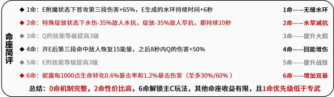 评价:对整个队伍提升都非常大的命座,因为妮露的天赋限制,无法带风系角色减水抗,而草套只能减30%草抗,这个命座弥补了妮露队伍在减抗方面的不足,在敌人具有较高抗性时收益会更大。