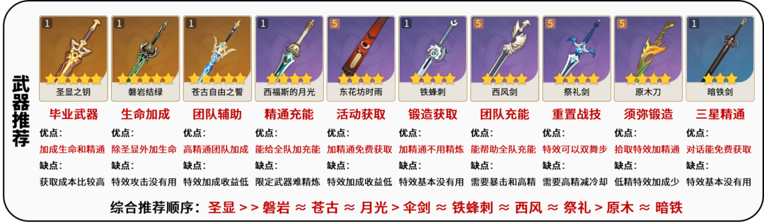 武器推荐顺序:圣显>> 磐岩 ≈ 苍古 >月光剑 ≈ 伞剑 ≈ 铁蜂刺 ≈ 西风 ≈ 祭礼 ≈ 原木 ≈ 暗铁