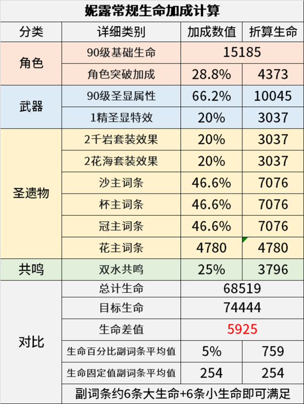 评价:吃满这个天赋妮露需要有74444生命值,没有高精专武是比较难吃满的,所以圣遗物全力堆生命就行。