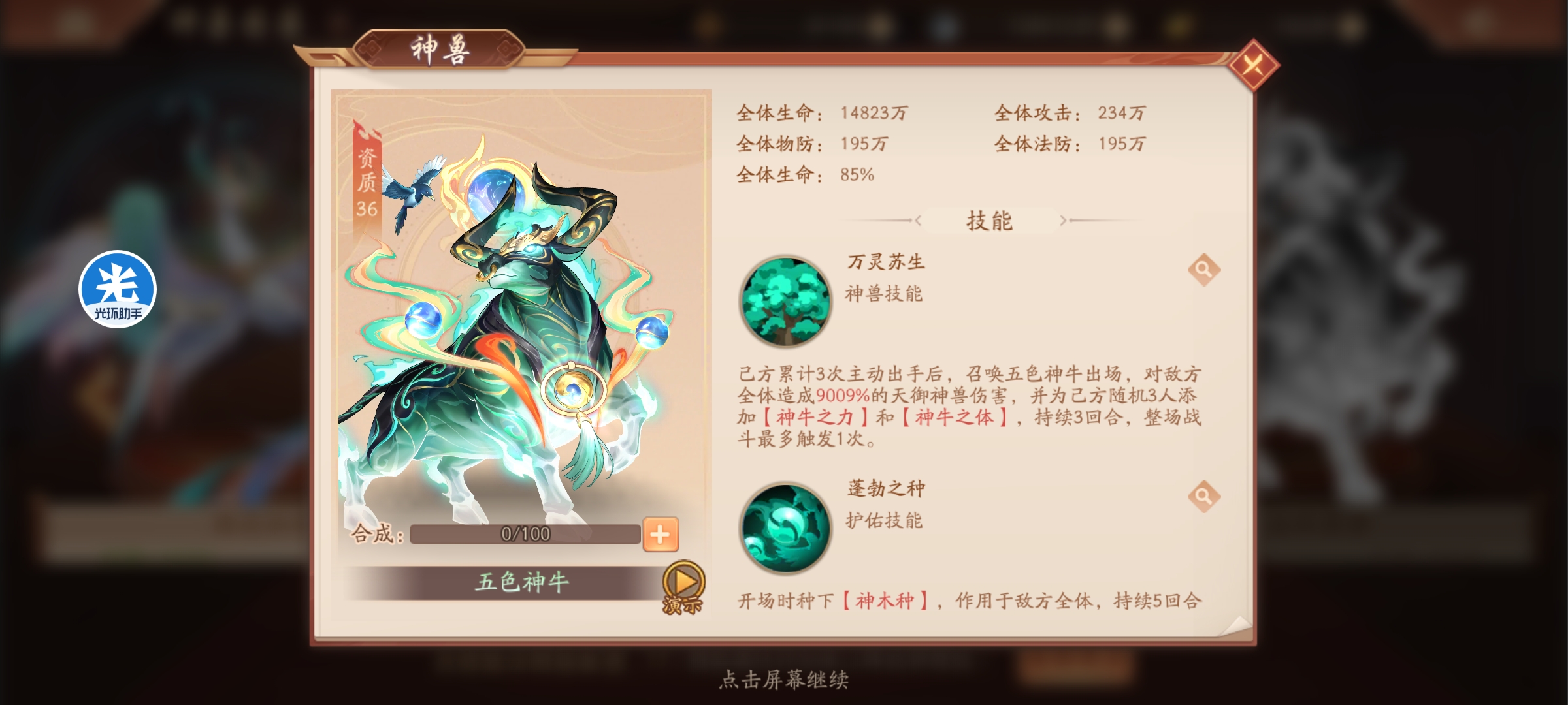 大家好,我是天池太子。天金四神兽五色神牛偷偷放出了图鉴,没意外的话就是4.20首发了。资质36,基础属性大幅提高。强度要比前三个高出很多,参照了天金四的成长效果,三星后有天金眩晕。