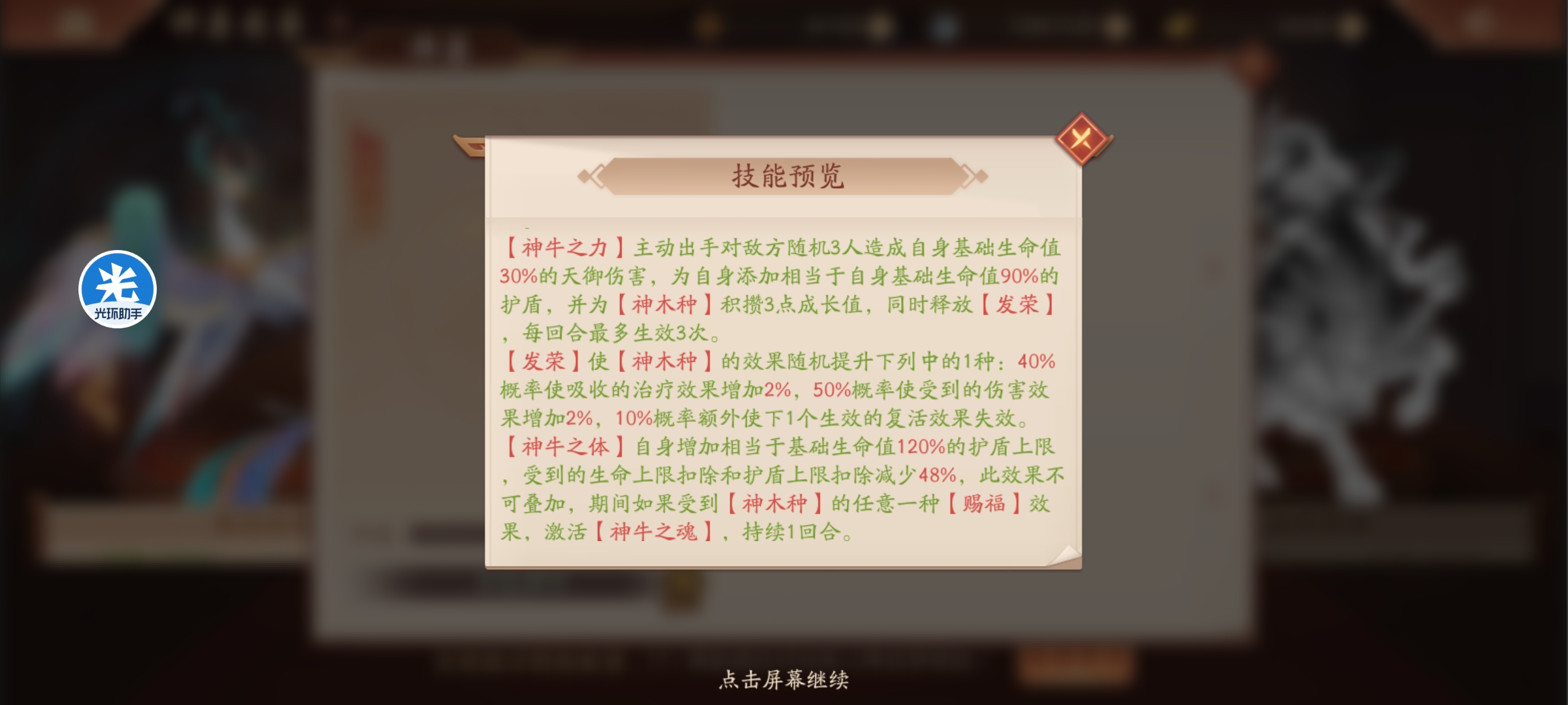 神牛之魂:每回合最多受到20个异常状态效果,且持续回合数减1,神牛之魂移除时为神木种积攒2点成长值。