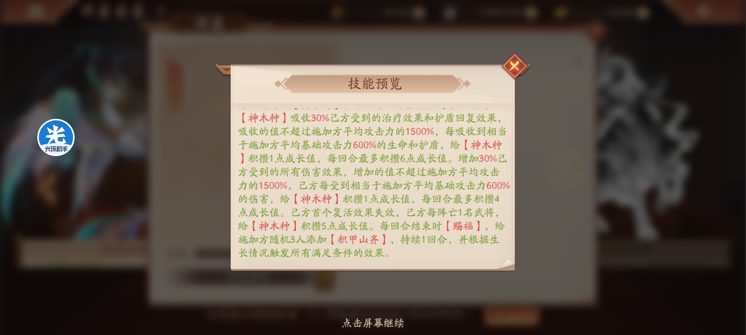 神木种:吸收30%我方受到的治疗效果和护盾回复效果,吸收的值不超过施加方平均攻击力的1500%,每吸收到施加方平均攻击力600%的生命和护盾,给神木种积攒1点成长值,每回合最多积攒6点成长值。