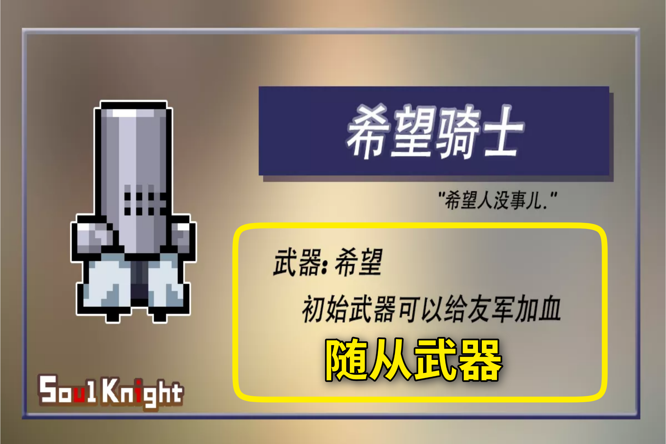 要知道牧师这名角色能够回血的能力在多人联机的模式下出场率还是颇高的,但是希望骑士作为一个辅助随从出现地牢,以后多人联机中牧师的地位将会进一步削弱,最根本的原因便来自于希望骑士所拥有的初始武器希望。具体的下面我们来聊。