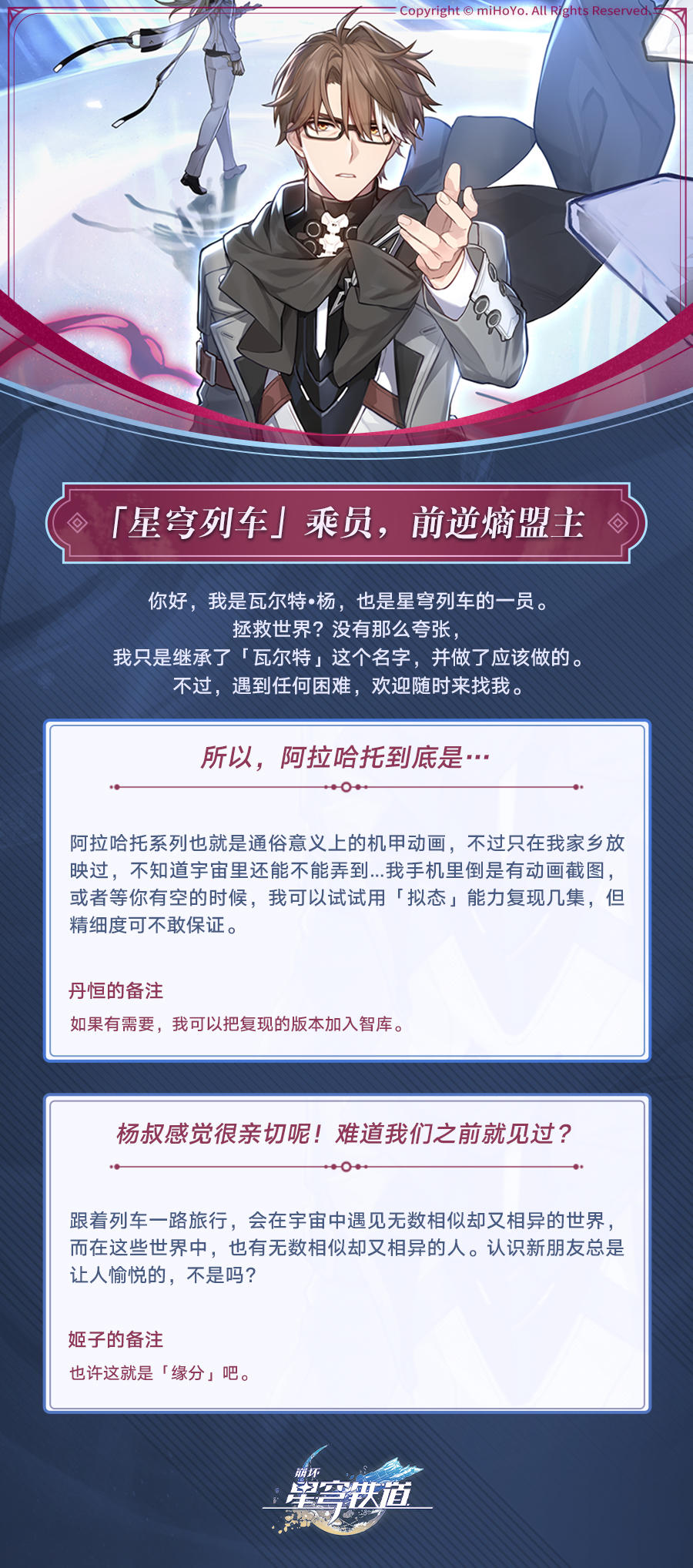 角色介绍 | 瓦尔特吃货酱酱发布于 2023-04-18关注 你好,我是瓦尔特•杨,也是星穹列车的一员。拯救世界?没有那么夸张,我只是继承了「瓦尔特」这个名字,并做了应该做的。不过,遇到任何困难,欢迎随时来找我。