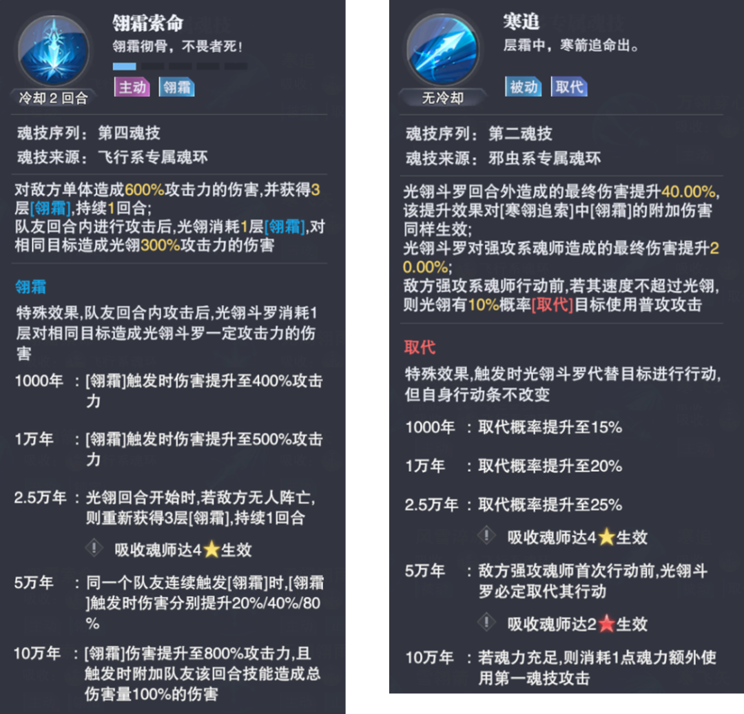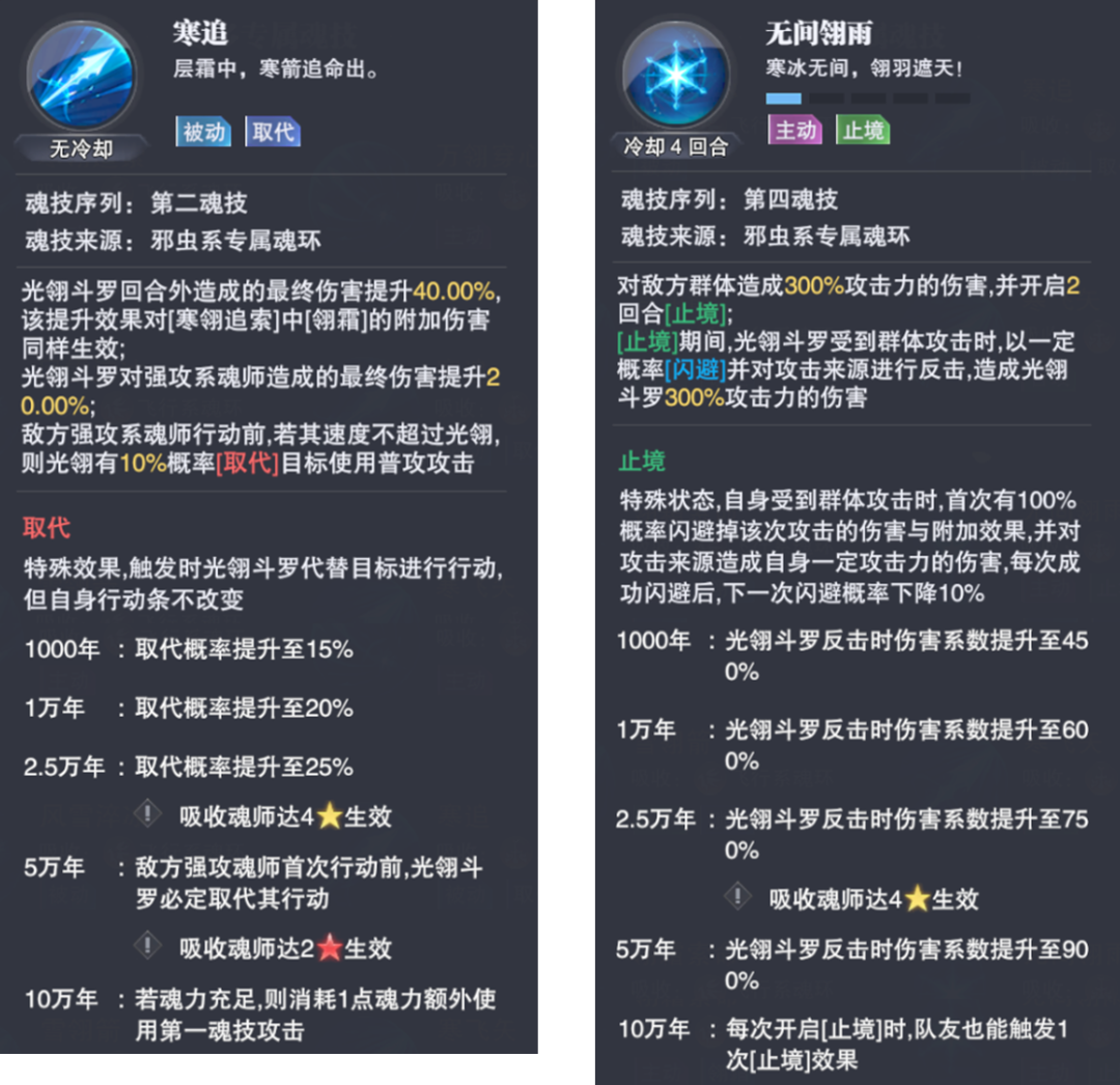 最后是PVP的实测结果 ,作为PVP中可以对敌方强攻系魂师造成一定妨碍针对效果的解法,光翎斗罗的PVP上场空间应该还算是不错的,其核心技能便是2-2被动的替代对方强攻系魂师行动与4-2技能的【止境】闪避效果,一个概率取代对方的强攻系魂师行动,一个概率闪避对方的群体攻击,官方你就说你在针对谁吧......SP尘心、唐烈和SP千仞雪这3位PVP的强攻系常客估计未来都会受到或多或少的影响,不过这个幅度到底有多高,测试服这低频的测试环境显然无法支撑我们拿到更多且更有远见的PVP对战数据,所以这点还是需要在正式服中的更多实战后才能知晓。