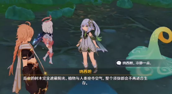 旅行者随后劝导:“纳西妲,冷静一点。”