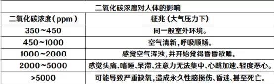 当二氧化碳的浓度达到1%(1000 PPM)时,人们会感到沉闷,注意力开始不集中,心悸。二氧化碳浓度达到1500-2000 PPM时,人们会感到气喘、头痛、眩晕。超过了2000PPM后,我们甚至不想继续工作,思考能力明显下降。5000PPM以上时人体机能严重混乱,使人丧失知觉、神志不清。时间稍长一点,就有可能危及生命。