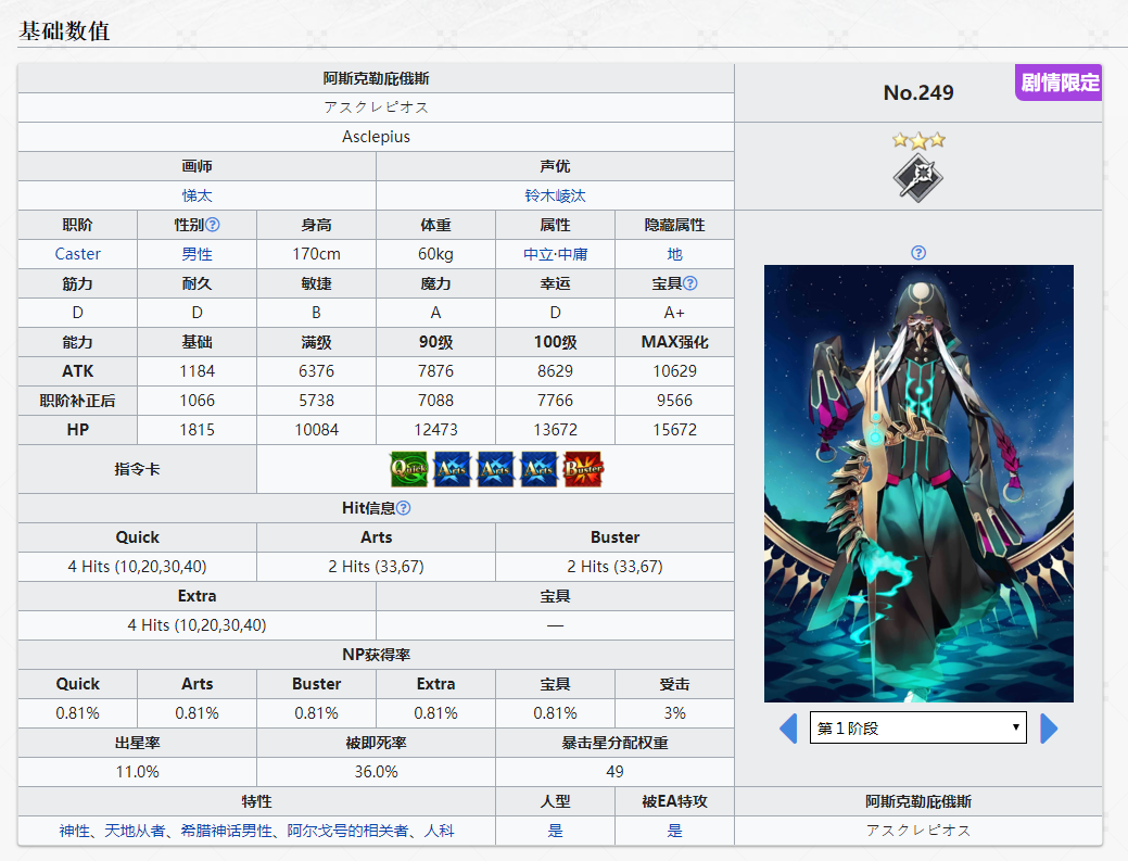 医神的ATK&HP是正常的三星术阶从者的白值,HP是三星术阶从者排名第二,ATK是三星术阶从者排名第七。