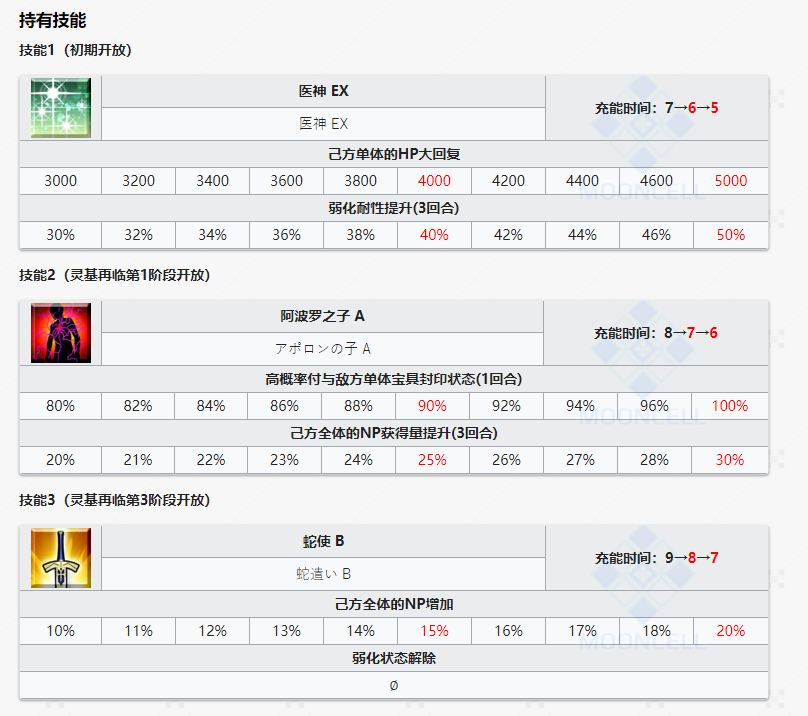 医神的技能辅助能力十分优秀,医神三个技能组涉及NP充能、NP率提升、弱化解除、宝具封印、回复HP、弱化耐性提升多个方面的辅助,这些技能属性效果可以看出医神是一个强力的功能型辅助从者。