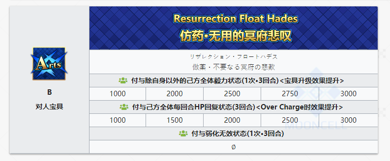 其次宝具还有一个己方全体随OC(宝具过充)的每回合回复HP的续航BUFF,该BUFF浮动是1000~3000,每提高一次过充提升500HP幅度;