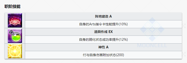 医神虽然蓝卡2hits,但是NP率有0.81%,二技能的己方全体30%NP率提升也可以辅助自己,职阶技能(被动)有个「阵地建造A」,「阵地建造A」增加医神10%蓝魔放,也可以用于增加医神的NP回收。