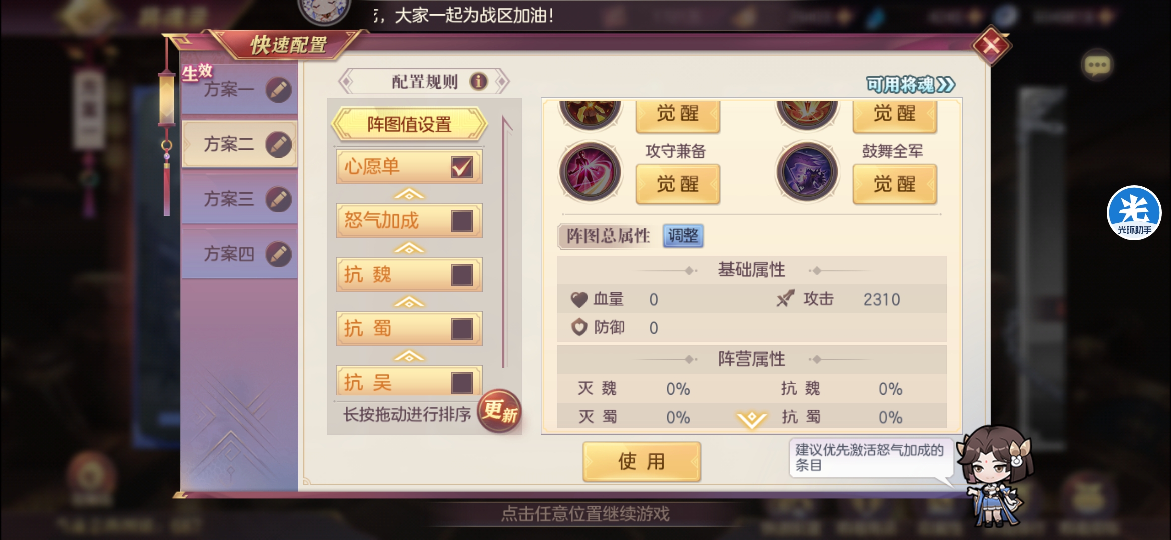 注意这是主阵容一个队伍的选择,如果为了打天下会武,由于上阵武将很多,基本覆盖全职业,因此最好点满所有怒气加成,可以跳过添加心愿单这一步骤。直接勾选怒气加成