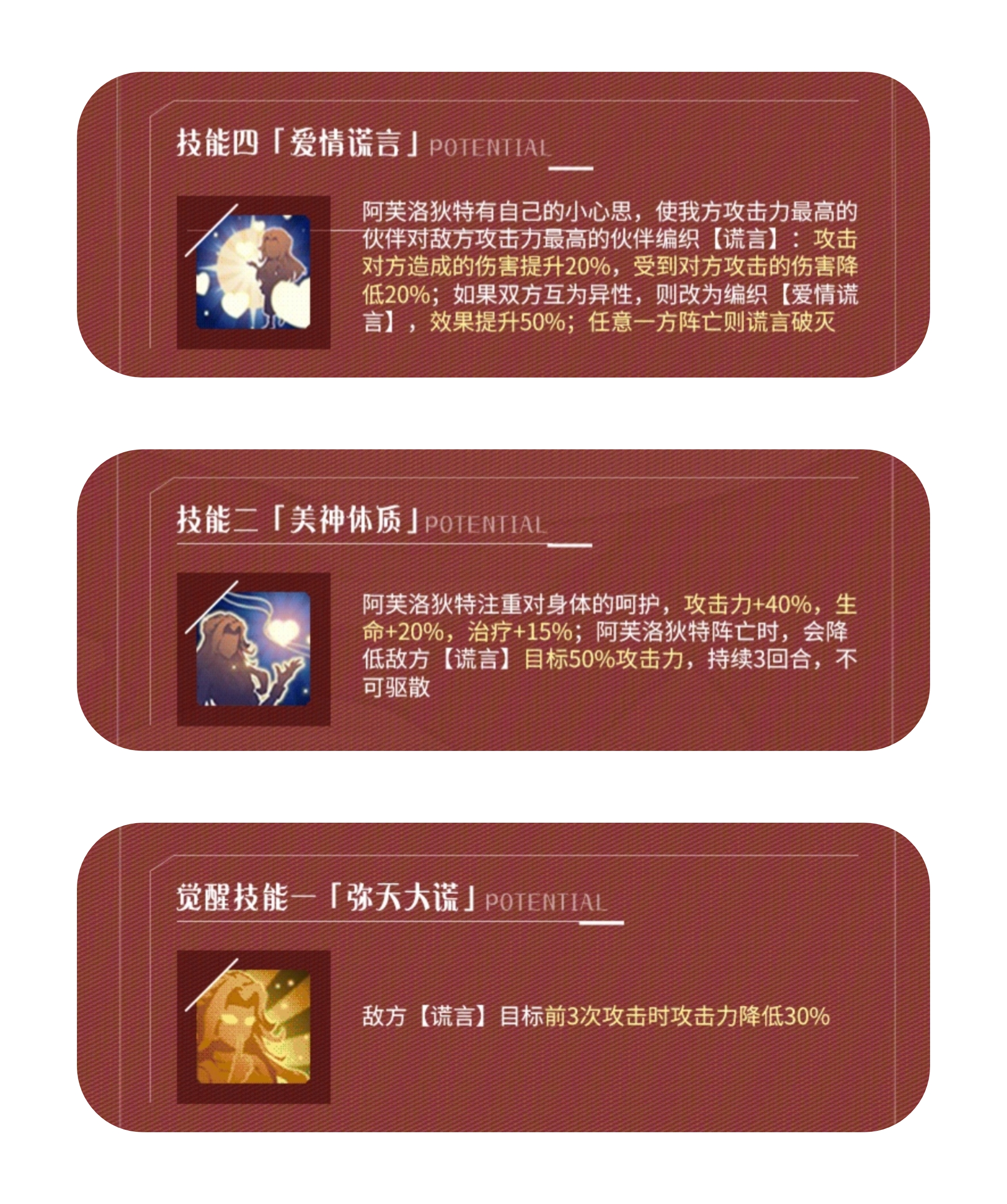 被动一:阿芙洛狄特阵亡,则降低敌方【谎言】者50%攻击力,持续3回合,不可驱散。