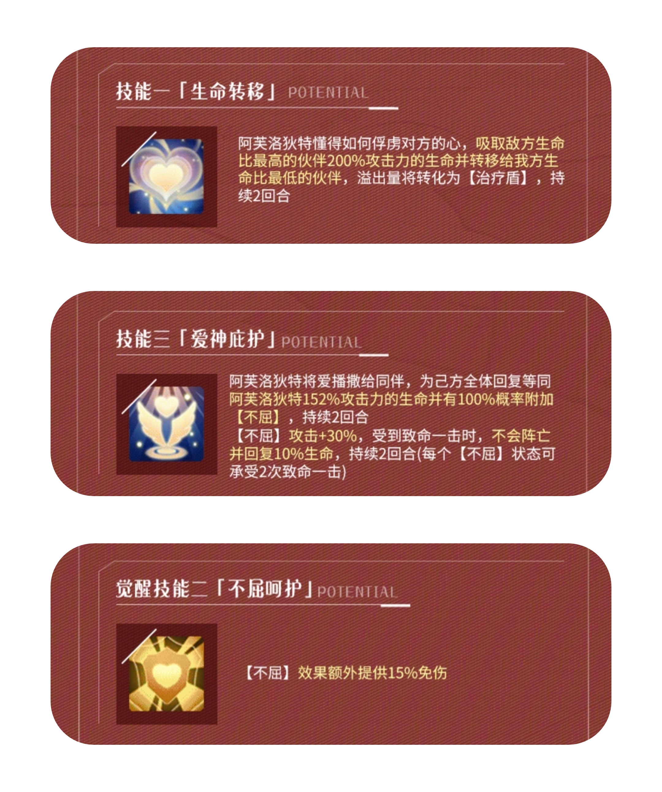 大招:为己方全体回复等同自身152%攻击力的生命并全员附加【不屈】:攻击+30%,受到致命一击时,不会阵亡同时回复10%生命,持续2回合。