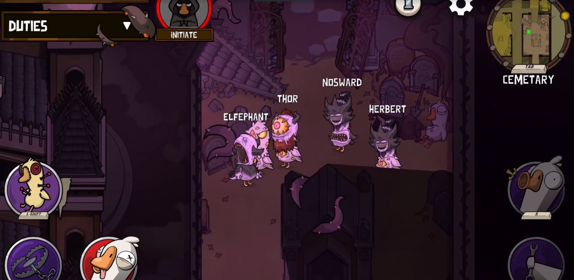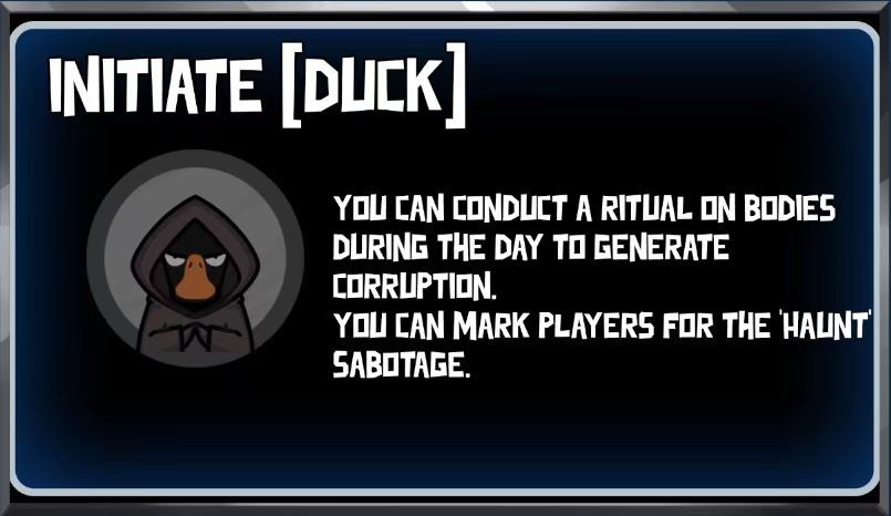 白天的时候可以吃尸体并释放仪式,生成一个腐化碎片,其他鹅捡到将不知不觉的被腐化,晚上其产生的腐化物可以增强鸭子的能力,同时新入会者也可以标记玩家以开启破坏行动,他可以确保破坏行动释放在指定玩家的身上。