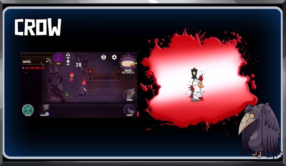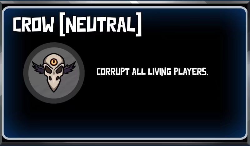 乌鸦技能类似鸽子,需要腐化地图中所有玩家,当所有玩家均被腐化后,将进入乌鸦时刻;乌鸦具有腐化定位能力,被腐化的玩家都会在乌鸦的小地图上实时显示。乌鸦时刻中的乌鸦将获得更高的移动速度、无视墙体的视野以及范围杀人能力,并且处于无敌状态,只要处于身边一定范围内的玩家均可被乌鸦杀死;乌鸦需要在乌鸦时刻的倒计时内杀死所有玩家才能赢得比赛,若倒计时内没有杀死全部玩家,乌鸦将直接死亡。