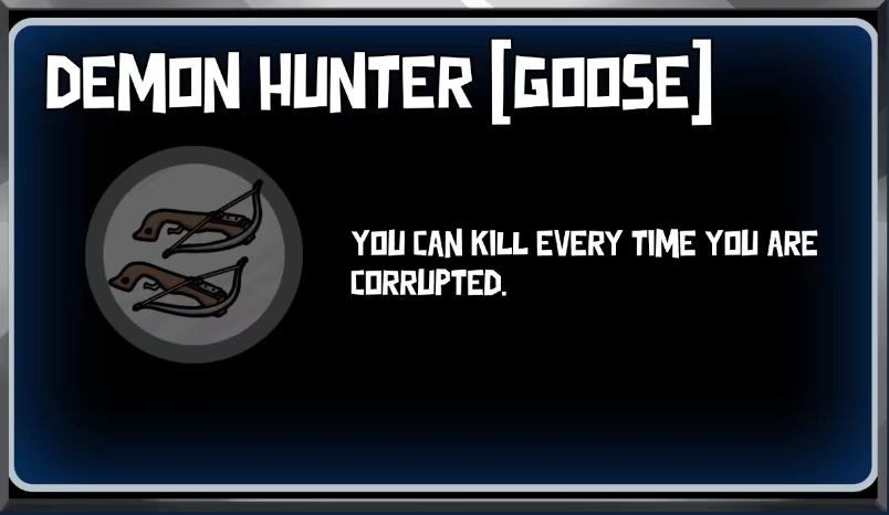鹅拾取过多腐化物进入腐化状态后,白天也将看不见其他玩家的id名称,一般的鹅进入腐化状态后只会有形态上的变化,但恶魔猎手也可以通过腐化以获得更强大的能力,进入腐化状态后,恶魔猎手将获得一次出刀杀人的机会,每一次独立的腐化都将让恶魔猎手获得一次出刀的机会。