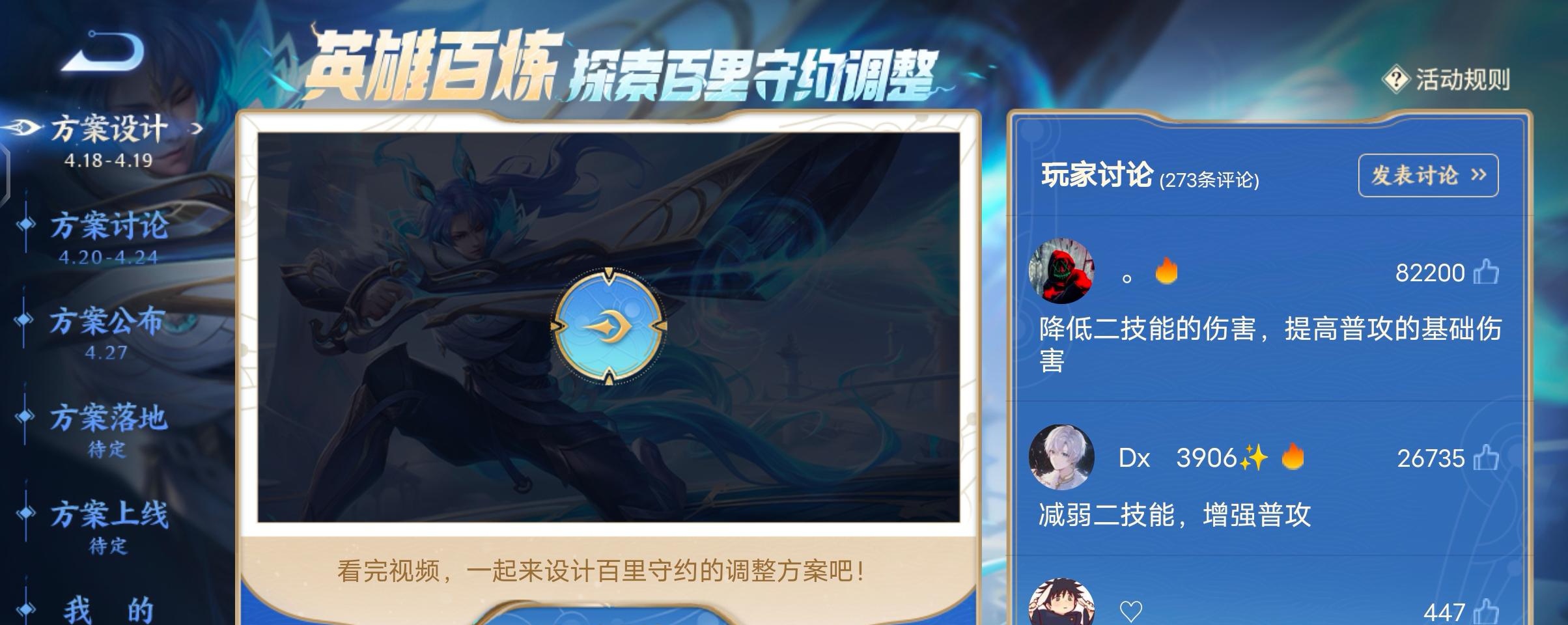 关于百里守约共创调整我的看法光环用户_twosbs发布于 2023-04-20关注我觉得这次调整守约的目的性,已经很明显了,降低守约的热度,让守约的二技能不管在物理科技还是认为技术的加持下不那么容易不被反制因为一个百分百命中的守约,他是极具不平衡的,也是很难反制的,这也造就了他是个不稳定的拥有极高上限的英雄所以可以围绕二技能进行调整1,首先可以增强二技能的命中率,降低上限方法有增加二技能的判定范围或者二技能在瞄准敌人时,在敌人身上显示红色警戒的提示,提高二技能的下限,让守约不再难以上手且不稳定2,削弱二技能的射程,让守约的射击成本更高,以至于不会让守约太难反制3,削弱二技能伤害前中后期的各方面削弱伤害,增加守约普攻的伤害,4削弱二技能的储存数量,以至于降低守约的收割能力