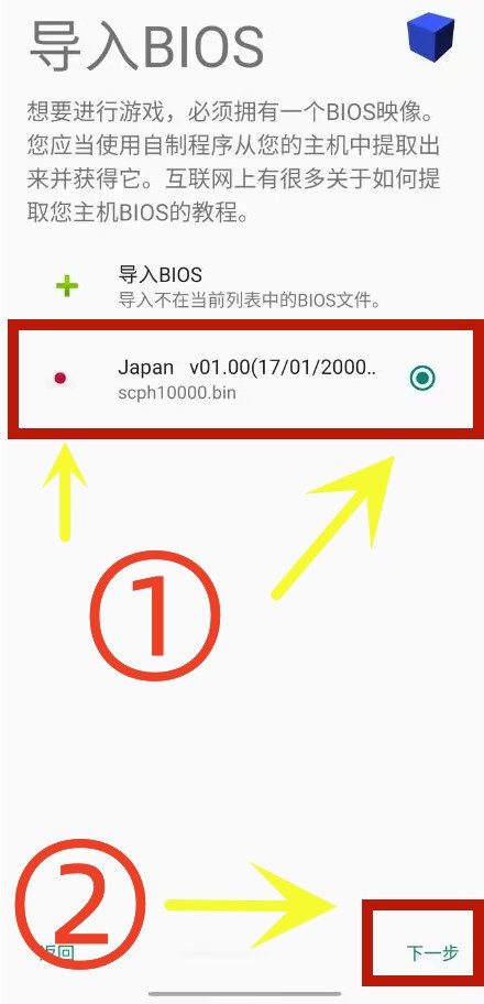 “以太模拟器”带有一个 Japan v01.00的(17/01/2000)的BIOS文件;点亮圆点后,点击下一步...