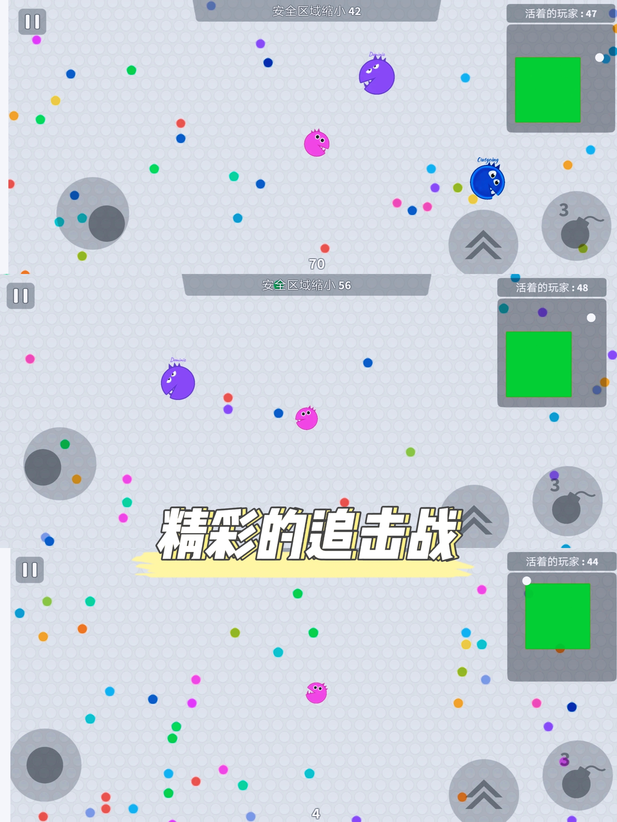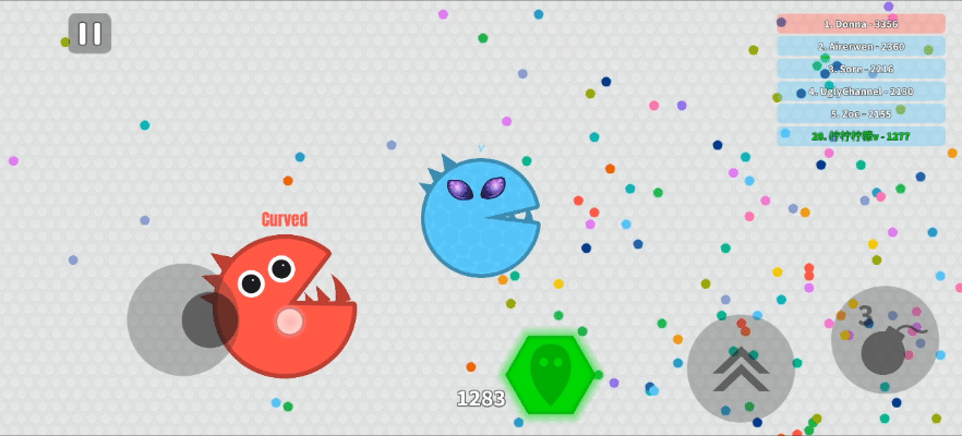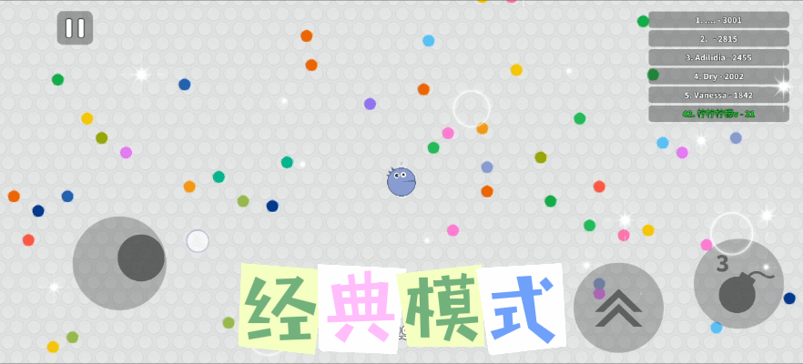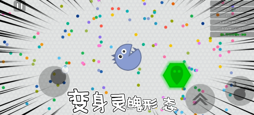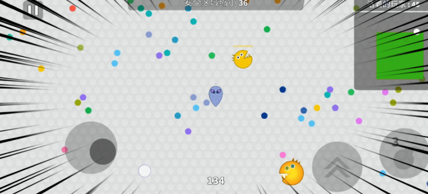 ✍游戏中左手控制球球移动拾取地图中彩色的点点,右手控制两个道具🎰。一个是冲刺道具,可以让球球向前冲刺一段,另一个是炸弹道具💣,这个道具可以减速追上来的灵魂形态玩家。