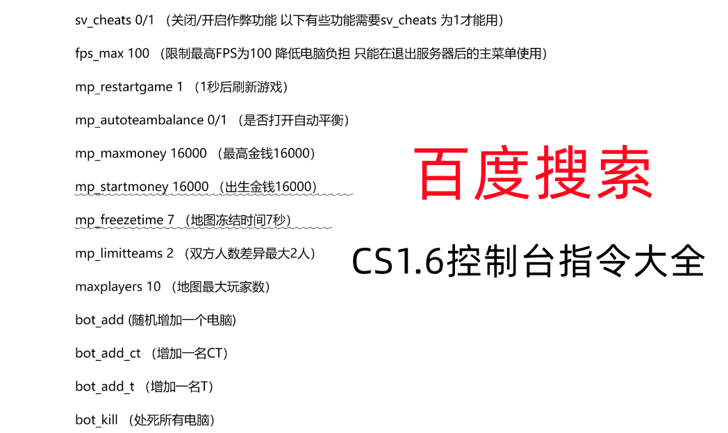 【控制台】就相当于一个万能AI,只要你输入对了指令甚至都能在房间里给你开启作弊码(练习用/朋友娱乐用)。当然了,这里只展示了一小部分的代码,更多可自行百度“CS1.6控制台指令大全”。