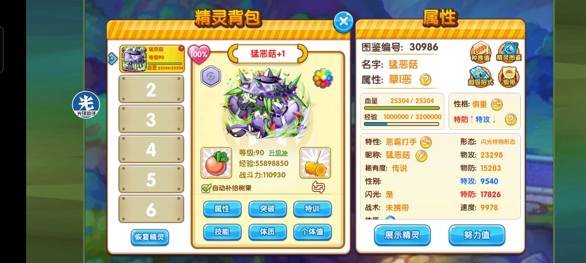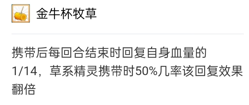 首先就是草系精灵的专属级别回复类道具金牛杯牧草,这个道具比赛出过白嫖,后面活动也出过一次白嫖,但是效果非常好,每回合除了1/14的回血收益,还有50%概率回血翻倍,只要对方一下打不死,回合一拖,又是满血的好汉,而且配合猛恶菇的特性,拖回合后又是回血又是替身,简直让对方奔溃。