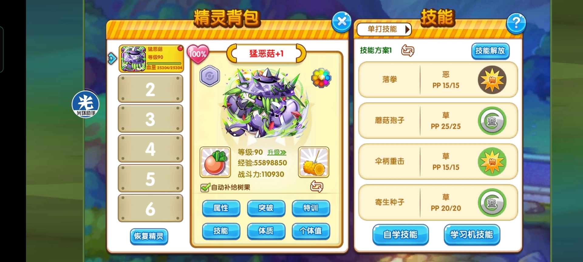 当然最核心的技能就是蘑菇孢子了,这简直是游戏里面最离谱的控制技能,绝对的催眠状态,让对手很难处理,比达克莱伊的黑洞还离谱,目前的环境中,防状态的宠物并不多,只要解决了防状态宠,猛恶菇的蘑菇孢子绝对是神技,我的玩法目前是打落拳,丢蘑菇孢子,如果对方不走就继续丢寄生种子,如果对手切了,我就继续落拳。