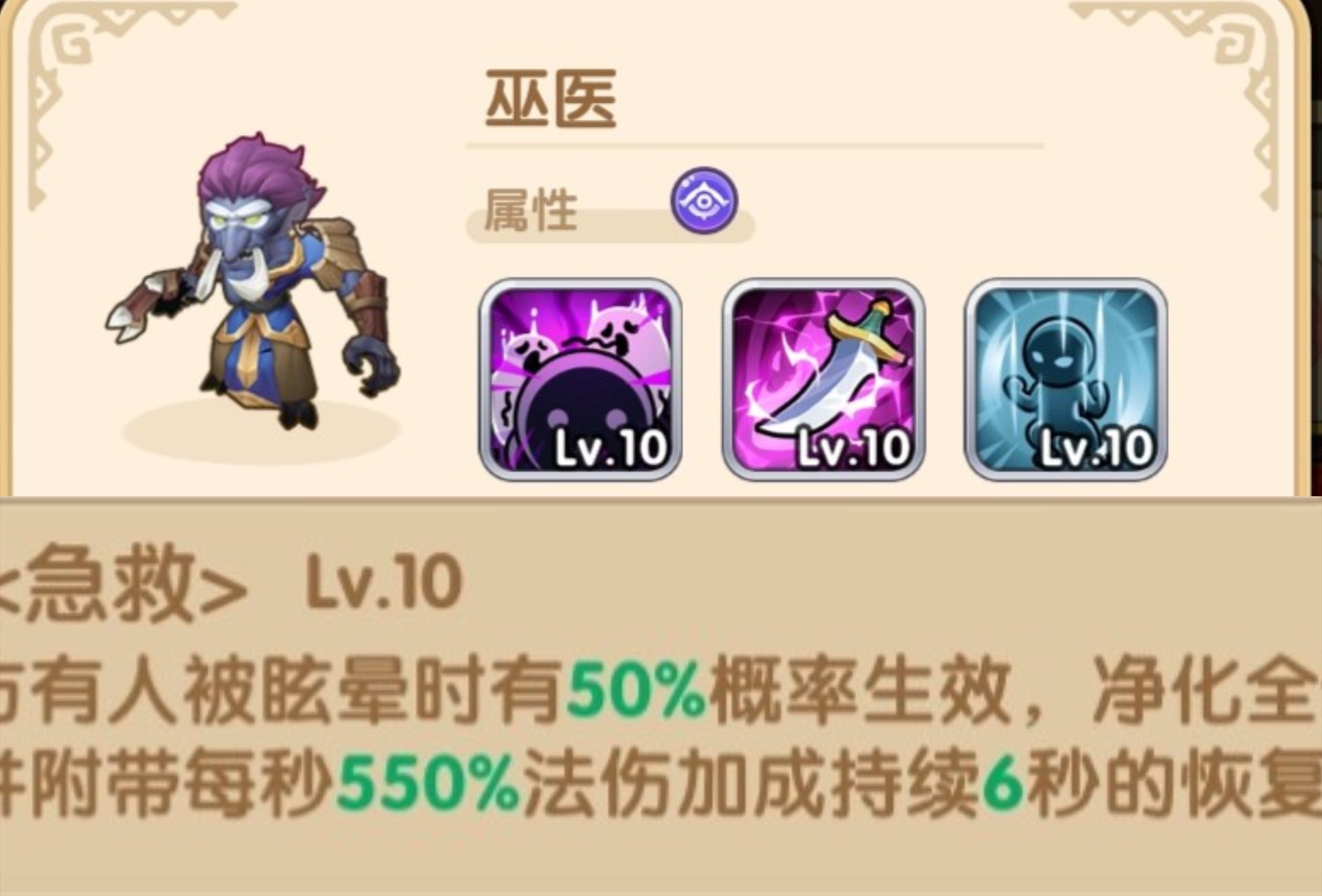 第一种方法:一般这种敌人技能的搭配组合都是眩晕+沉默。那么我们就利用到【巫医】这个宠物来去应对,可能大家没有发现这个宠物的被动,巫医三技能被动在1级的时候就有50%的几率解除全体负面状态的效果,所以1级就可以用了,任何控制效果,包括任何负面都可以解除。很多时候我们在被永久沉默的时候,boss也会释放控制技能攻击我们,比如眩晕,只要控制到我们任何一个人,这时候50%几率全体解除负面状态。所以这个还是挺好用的。