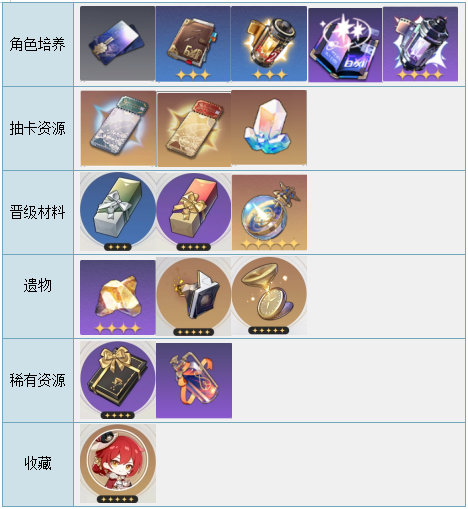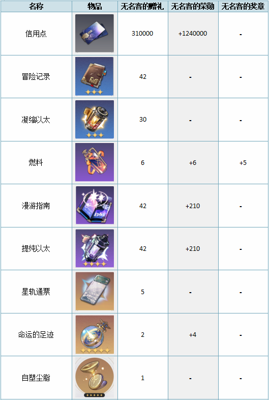 按照最高挡位的无名客的奖章来看,玩家共可以获得17种物品,我按照各物品具体的功能做了以下图表,以供理解。