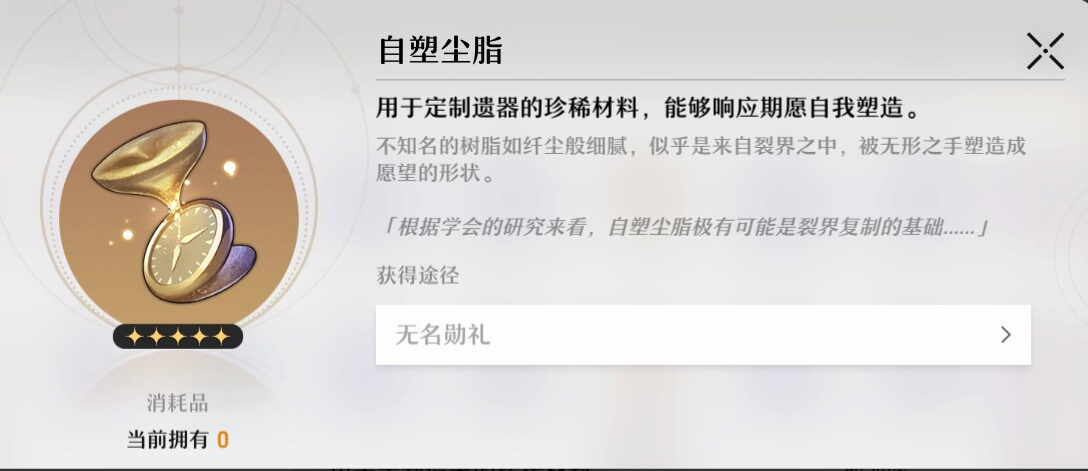 勋礼中有2个特殊的物品,一个是可以定制遗物属性的自塑尘脂,另一个是可以自选光锥的星海宝藏