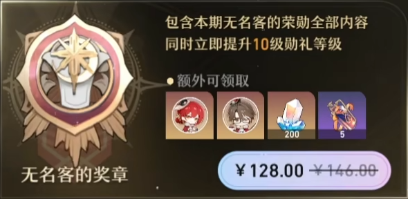 无名客的奖章:开拓者等级到达13级后将开启购买选项,128RMB,付费挡位。
