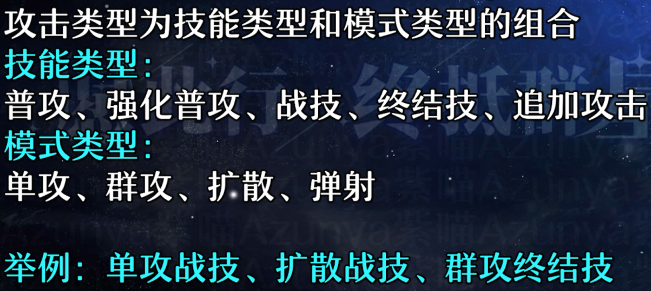 攻击类型有普攻、强化普攻、战技、终结技、追加攻击五种技能类型,在技能类型之下又分为单攻、群攻、扩散、弹射四种模式类型。